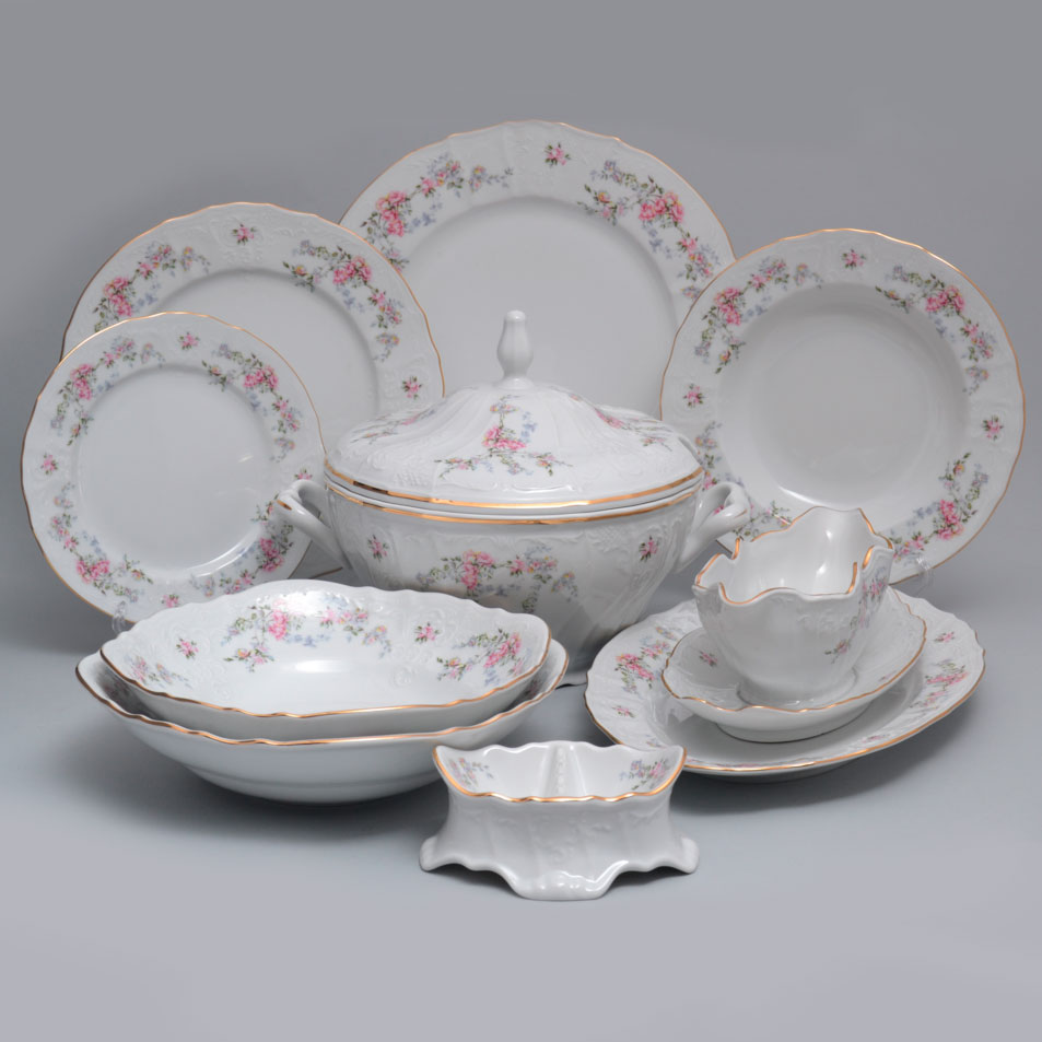 Этот набор — не просто посуда, а воплощение элегантности в фарфоре. Белоснежные тарелки украшены нежнейшим цветочным рисунком в акварельной технике и обрамлены изысканным золотым кантом. Они превращают каждую трапезу в праздник\ и придают столу особую эстетику, где даже обычный обед становится поводом для удивления.