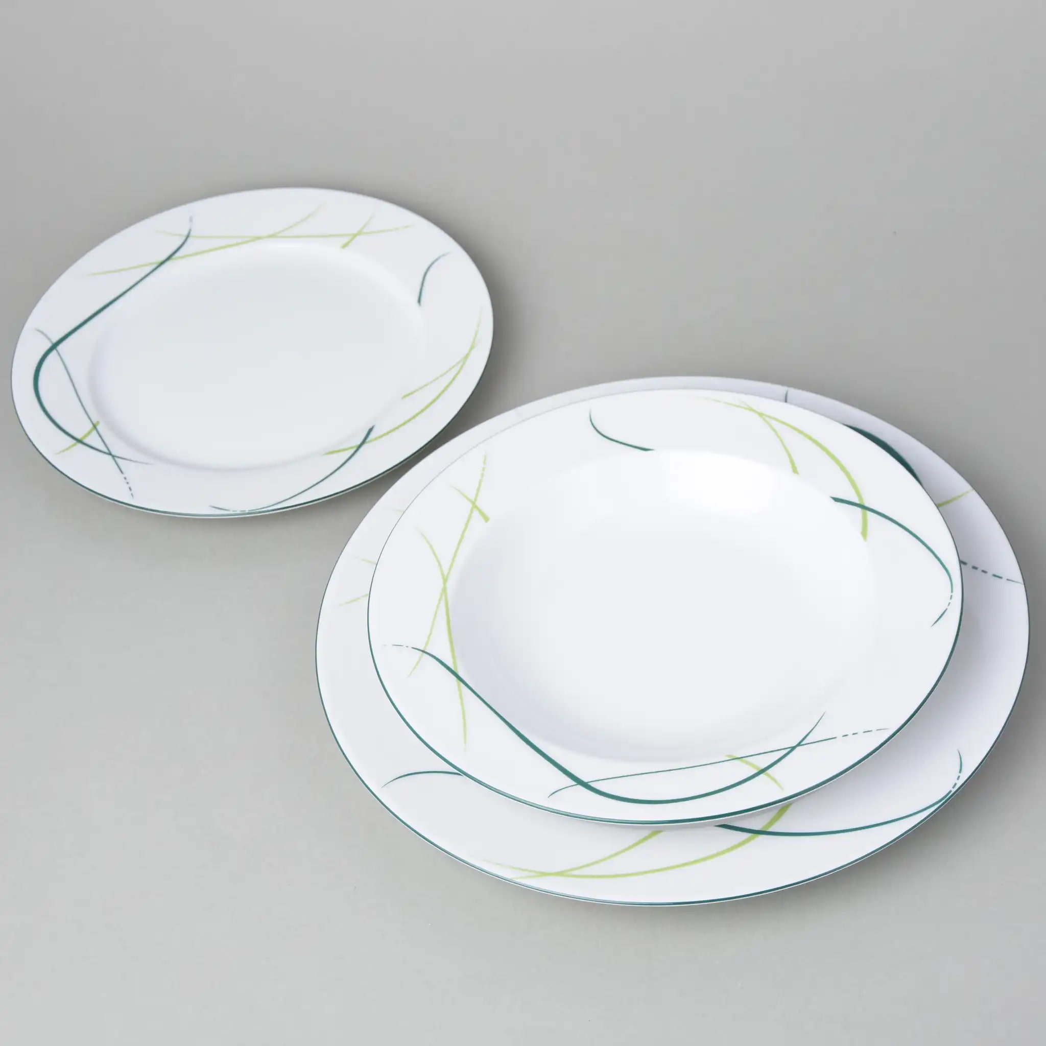 Набор тарелок Thun Opal из пяти разных размеров — это продуманная система сервировки, которая позволяет красиво и удобно подавать блюда любого формата. Белоснежный фарфор с изящным орнаментом в зелёных и жёлтых линиях выглядит свежо, аккуратно и актуально в любой обстановке — от повседневного завтрака до праздничного ужина.