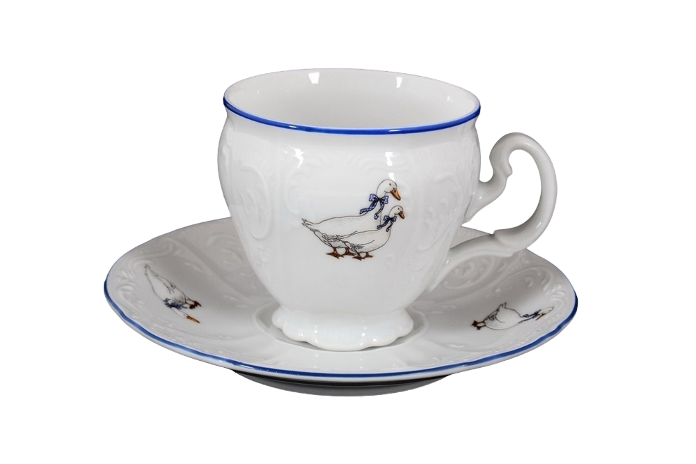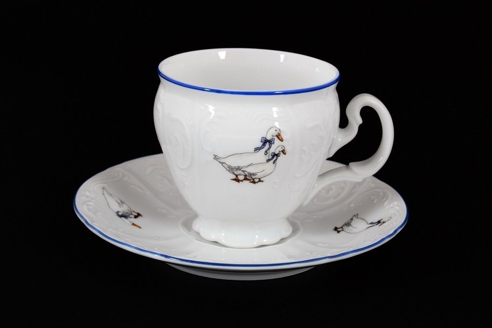 Набор высоких фарфоровых чайных чашек с блюдцами Bernadotte Гуси 240 мл/12 пр с синей каймой