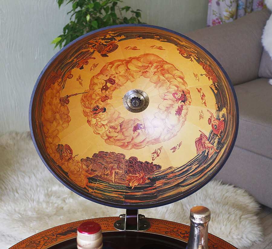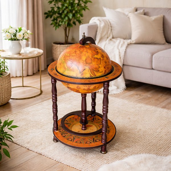 Напольный глобус-бар с дизайном в стиле старинной карты — это гармоничное сочетание классической эстетики, практичности и выразительного декора.