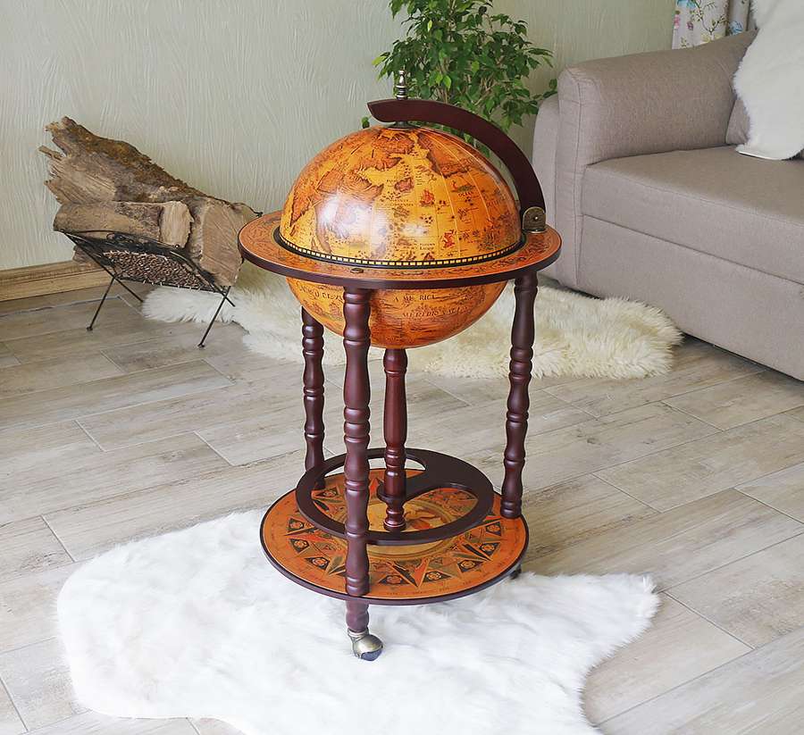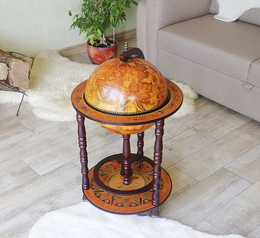 Сфера диаметром 33 см оформлена в виде винтажной карты мира, создающей ощущение глубины, истории и путешествий. Прочная деревянная подставка обеспечивает устойчивость конструкции и подчёркивает её статусный внешний вид. Внутреннее пространство удобно организовано для хранения бутылок и бокалов, позволяя создать полноценную зону домашнего бара.