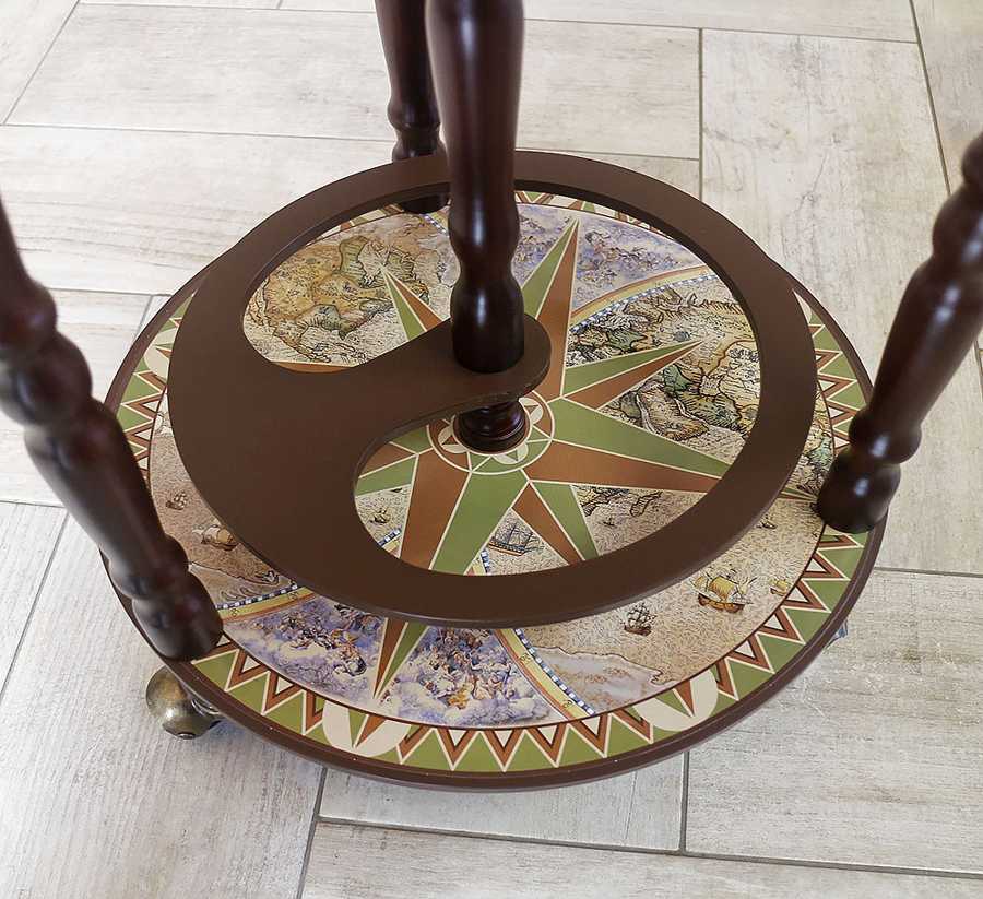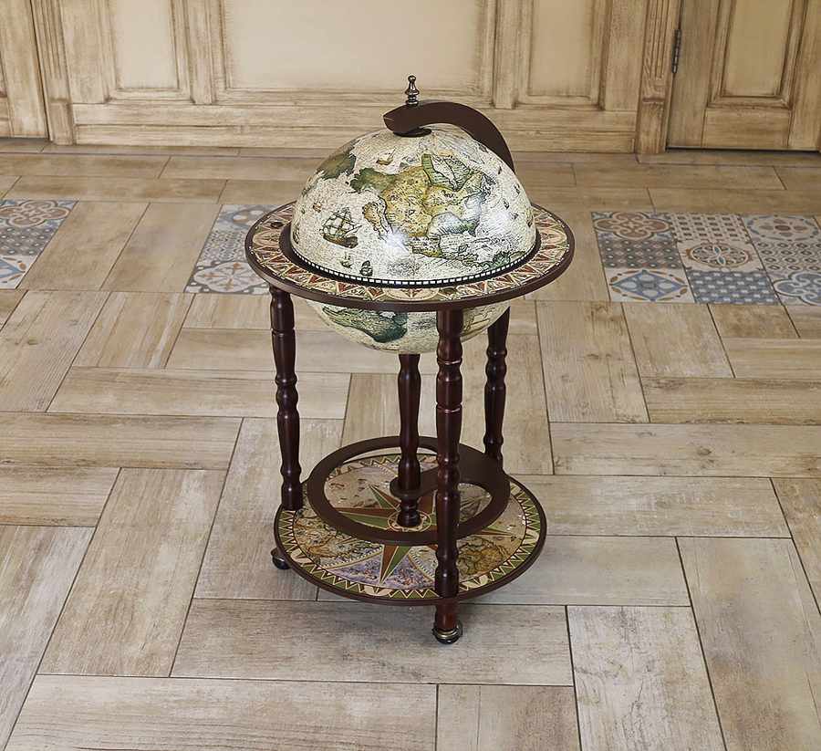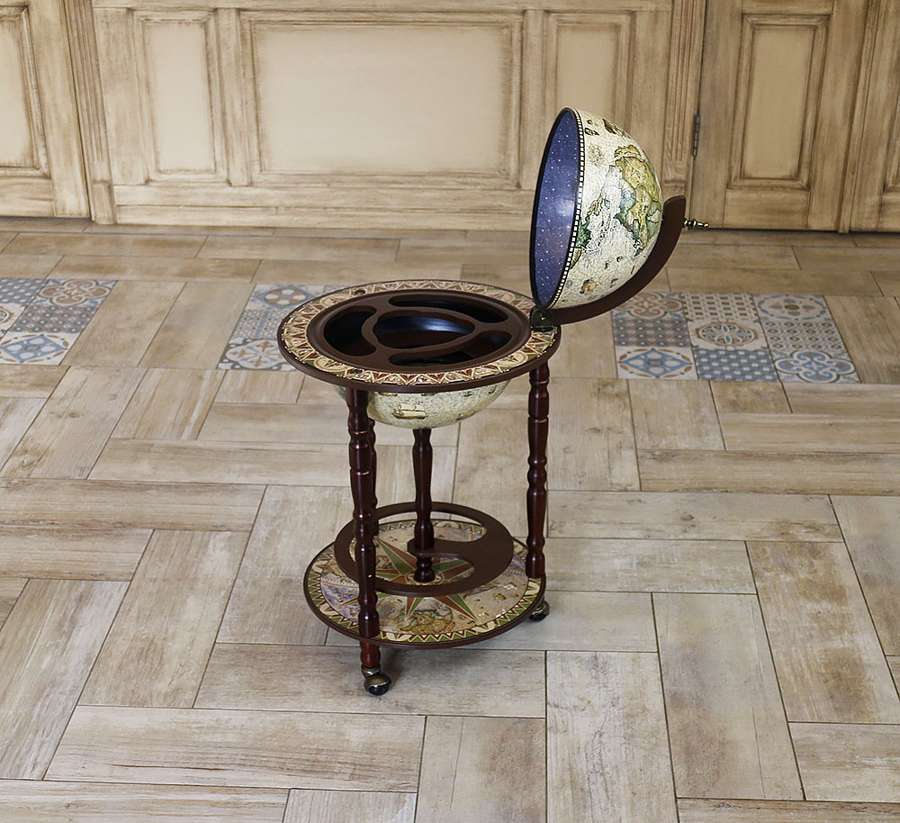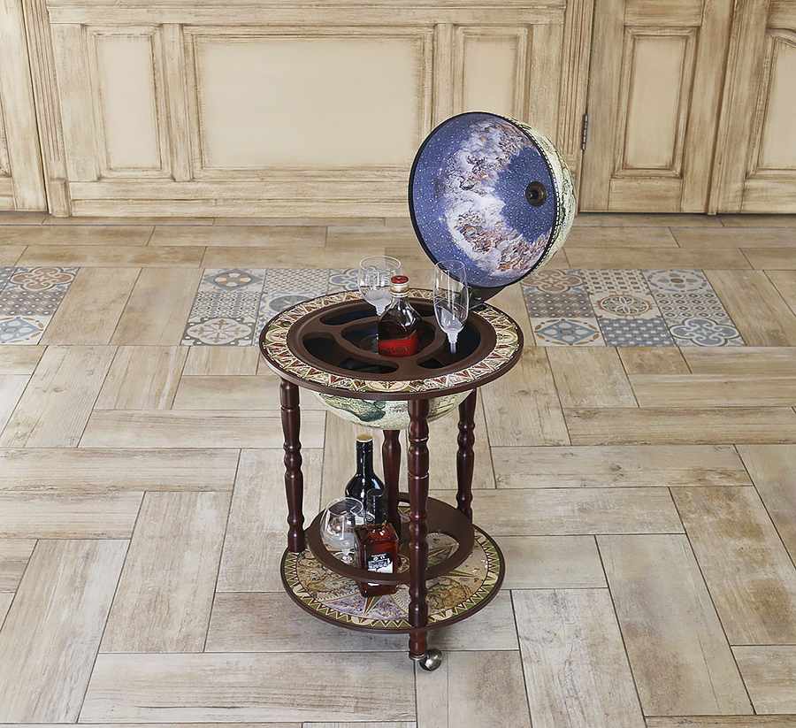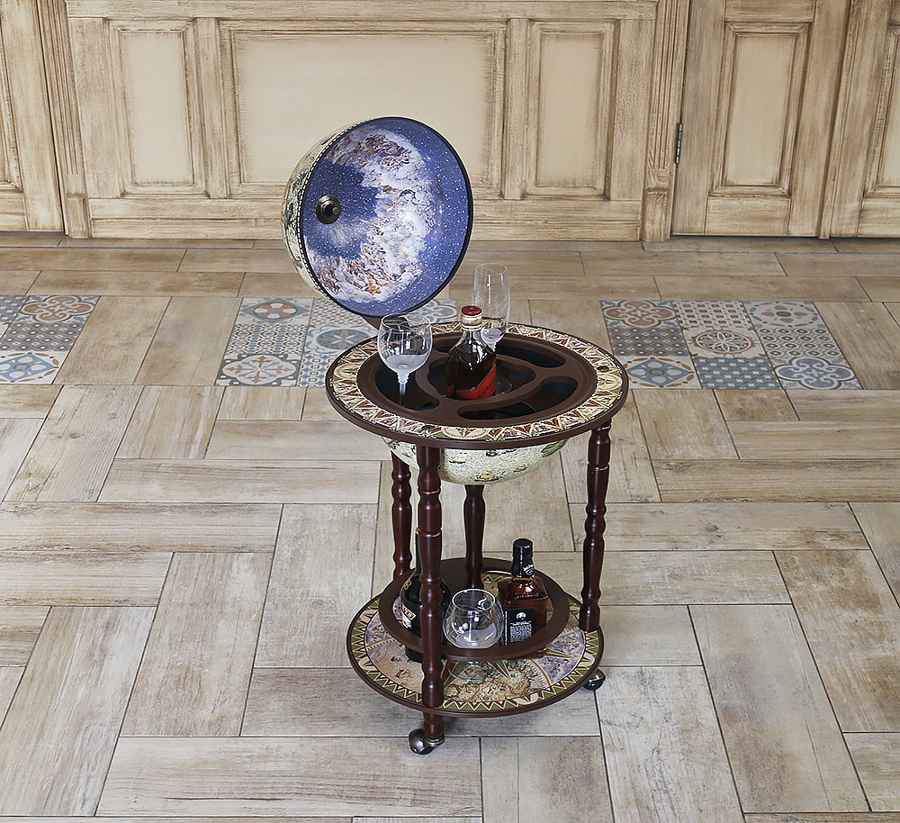 Современная модель напольного глобус-бара с двухуровневой конструкцией — стильное и практичное решение для интерьера.