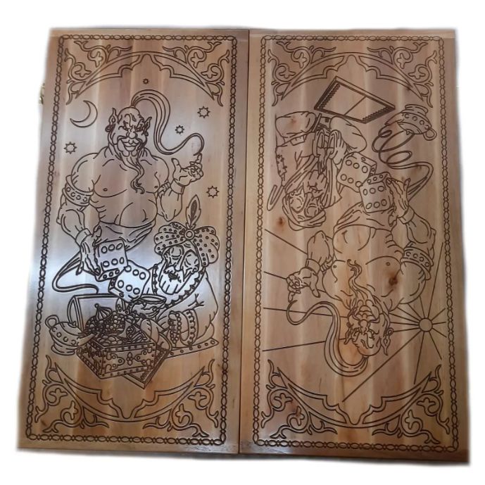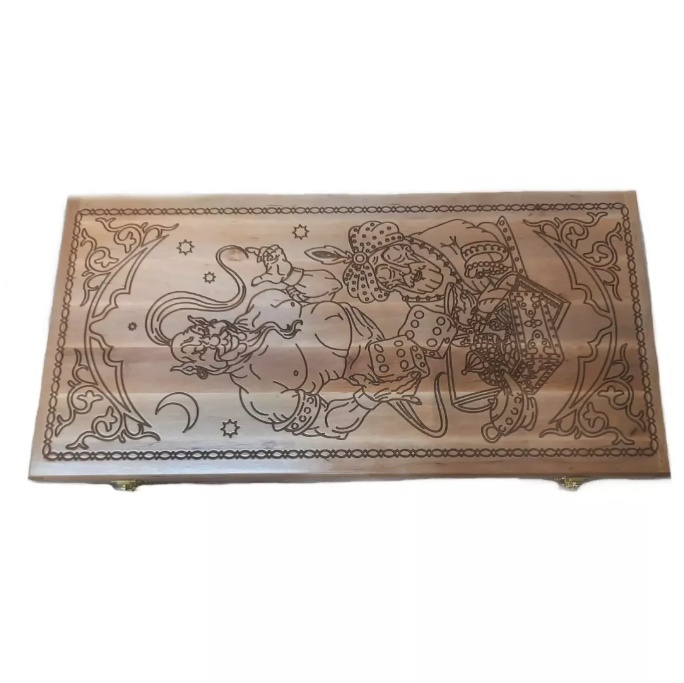 Эти нарды переносят в атмосферу восточных сказаний и древних легенд. Каждая доска создаётся вручную из качественной древесины и украшена изящной резьбой. Это не просто игровое поле, а художественное изделие, которое станет выразительным акцентом интерьера и добавит ему нотку таинственности и утончённости. На поверхности изображены Джин и Султан рядом с сундуком сокровищ, создавая особое восточное настроение и глубину образа.