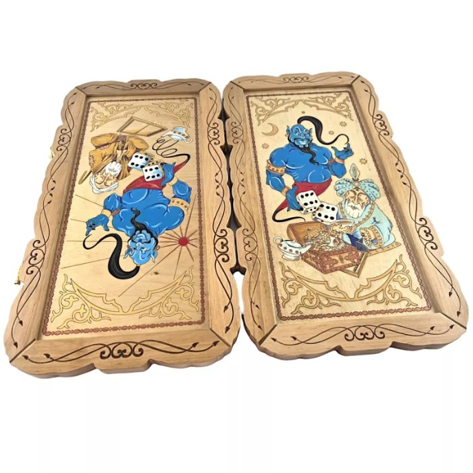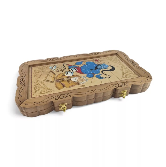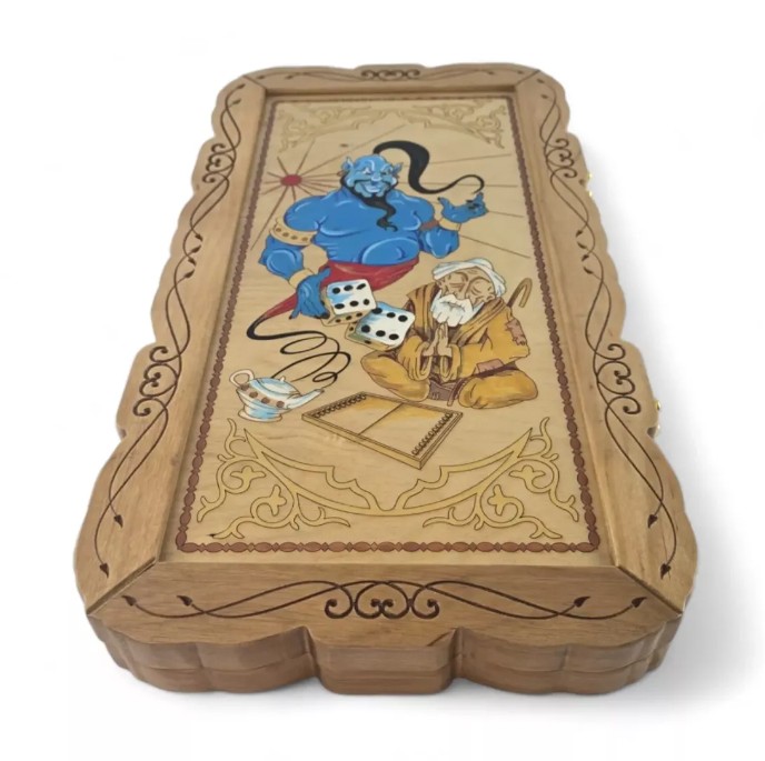Этот набор — настоящее произведение искусства, способное украсить интерьер и добавить в него атмосферу изысканности и таинственности. На поверхности доски изображены Джин и Султан, охраняющие сундук с сокровищами, что придаёт нардам особый восточный характер и загадочное настроение.
