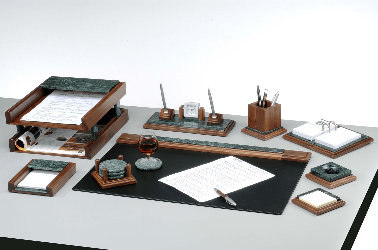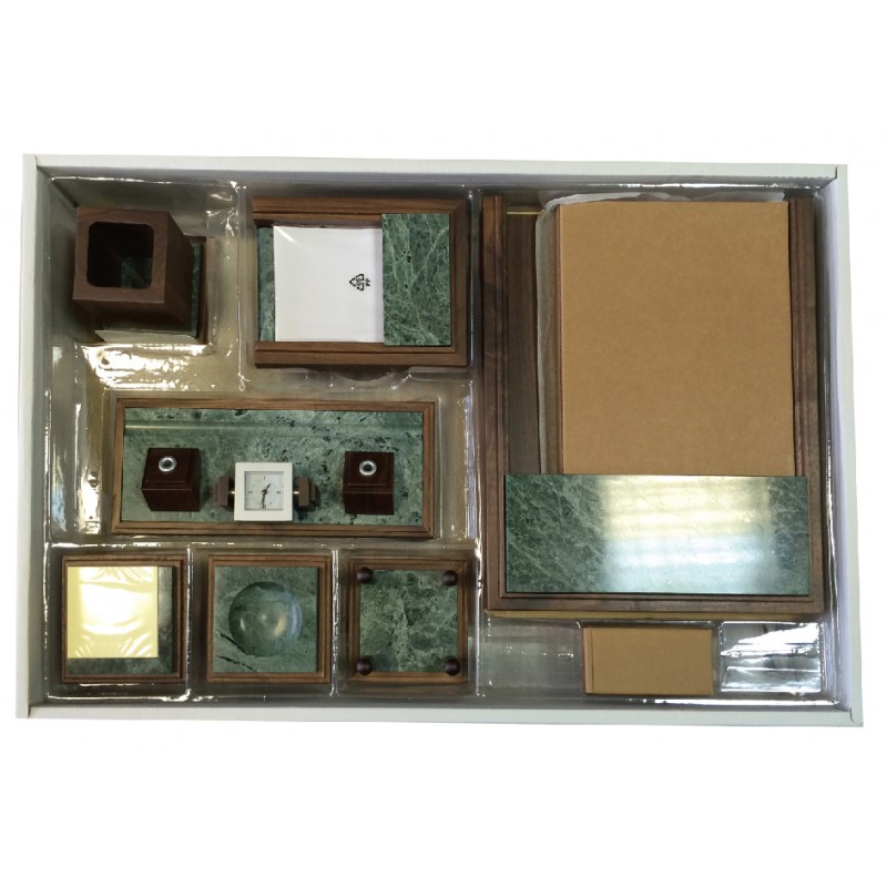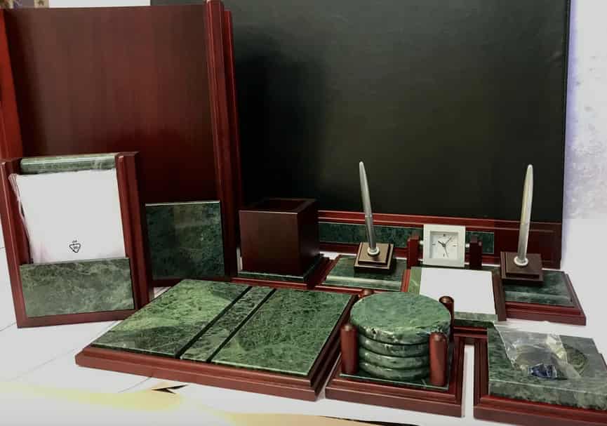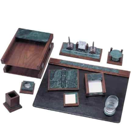 Набор настольный 9-ти предметный из натурального дерева и зеленого мрамора
