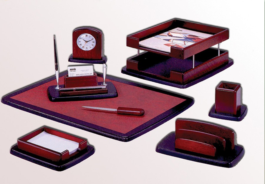 Изысканный настольный набор из красного дерева с черной отделкой способен украсить любой стол.