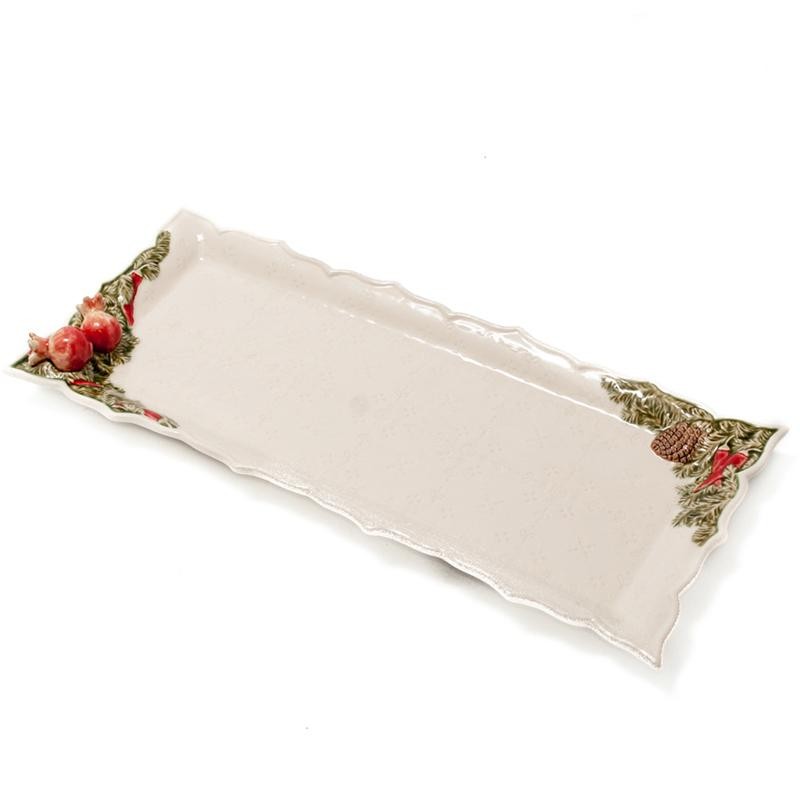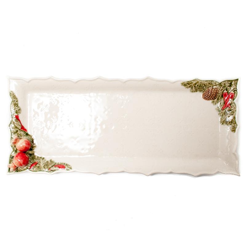 Така довга прямокутна страва з різьбленими краями оформлена в ніжному вершковому кольорі. Два його протилежні краї декоровані об'ємними кольоровими композиціями. Одна з них складена з ялинових лап, стручків червоного перцю та гранатів, а друга — з ялинових гілок, гранатів і шишок.