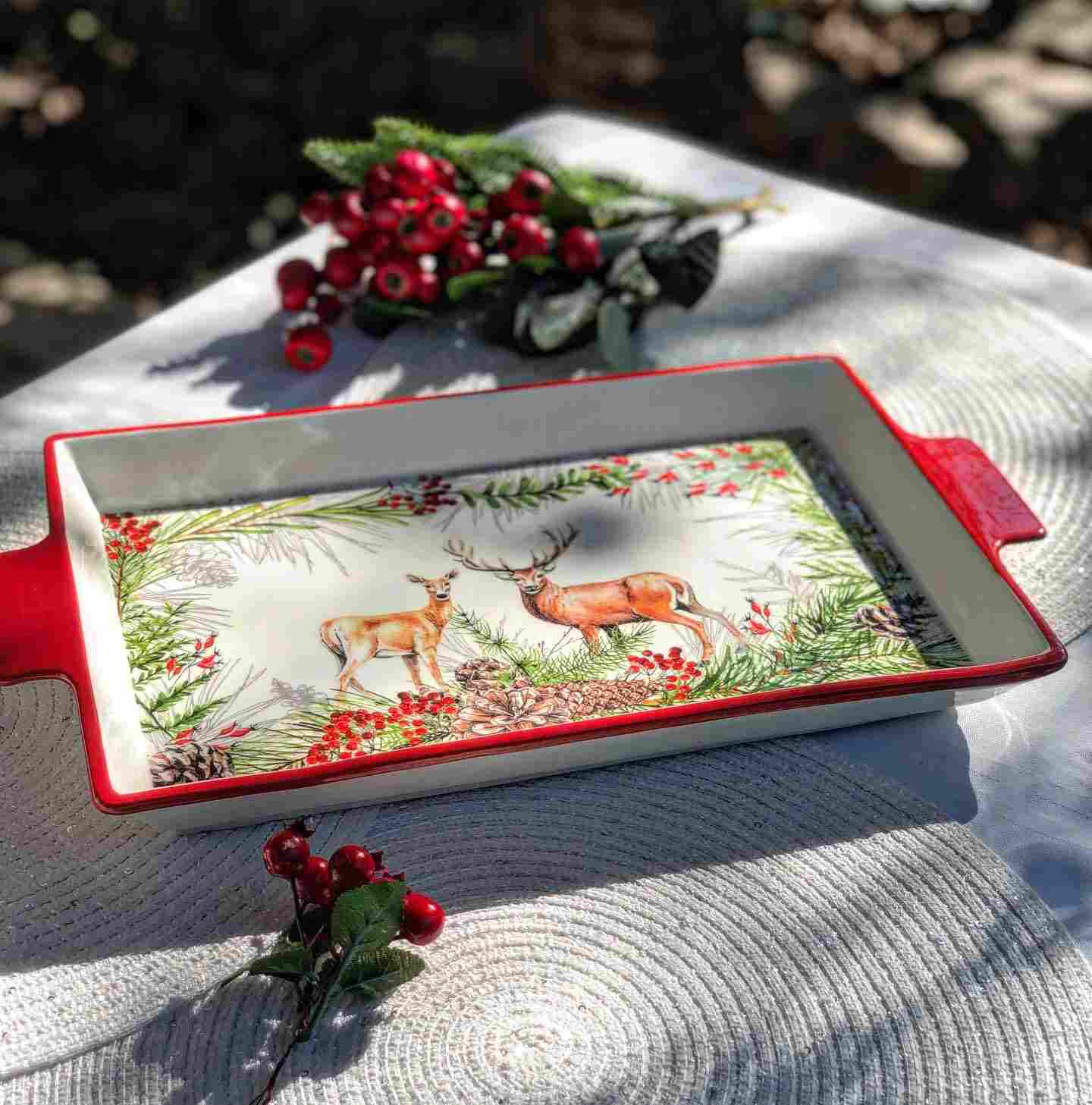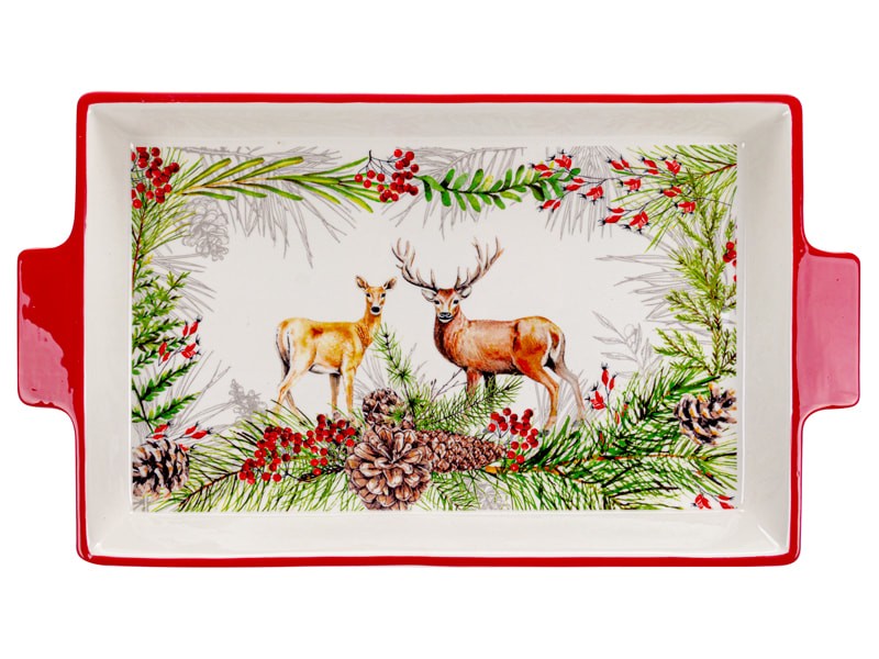 Керамическое блюдо «Лесная Сказка» длиной 41 см — это эффектный элемент праздничного стола, который сочетает в себе красоту зимнего пейзажа и практичность в использовании. Декор с изображением оленей среди хвойных ветвей, шишек и красных ягод создаёт атмосферу зимнего леса и подчёркивает уют домашнего торжества. Контрастные цвета и чёткие детали делают блюдо выразительным украшением сервировки.
