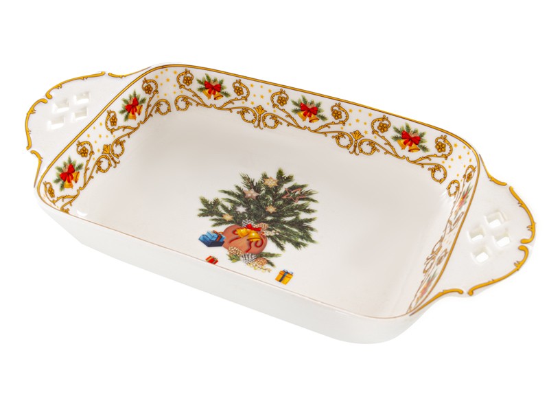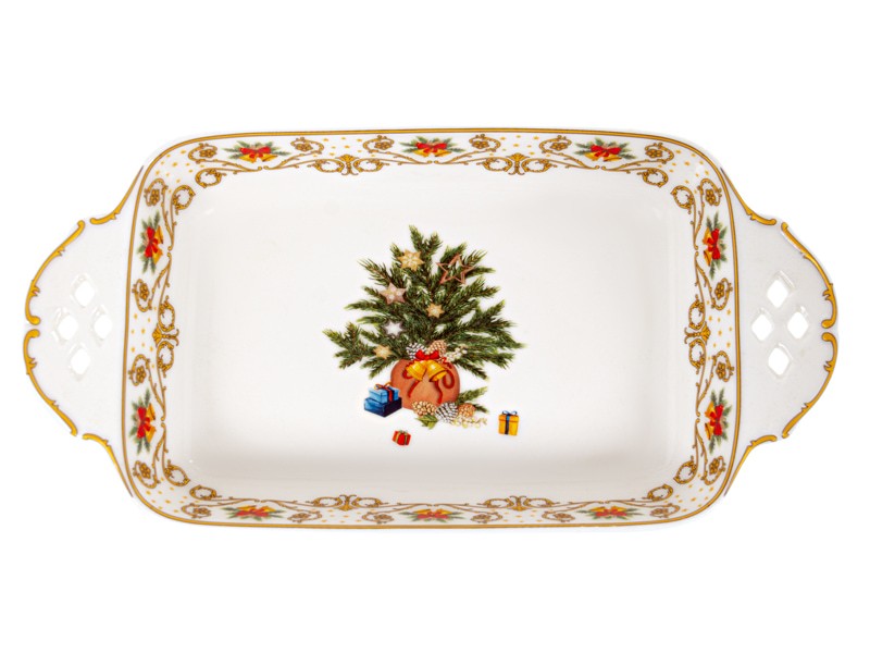 Рождественское сервировочное блюдо из фарфора диаметром Елочные Огни размером 30,5x15,5x5,5см см станет настоящим украшением праздничного стола. Изделие выполнено в изысканном дизайне с ярким новогодним узором: центральный элемент – изображение рождественской елки, украшенной игрушками и окруженной подарками. По краю блюда расположены декоративные элементы – золотистый орнамент и красочные изображения рождественских бантов и хвойных веток.