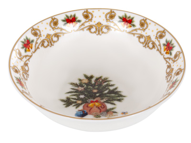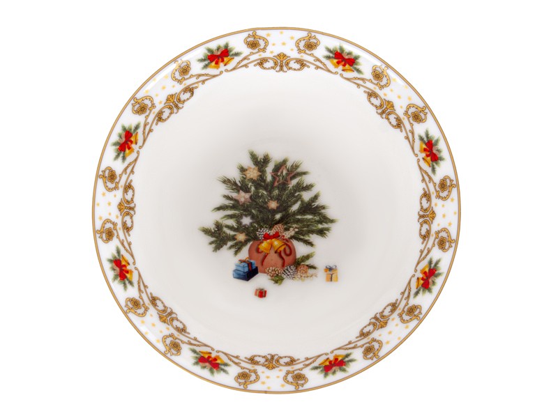 Рождественское сервировочное блюдо из фарфора диаметром Елочные Огни размером 16х5,5 см станет настоящим украшением праздничного стола. Изделие выполнено в изысканном дизайне с ярким новогодним узором: центральный элемент – изображение рождественской елки, украшенной игрушками и окруженной подарками. По краю блюда расположены декоративные элементы – золотистый орнамент и красочные изображения рождественских бантов и хвойных веток.