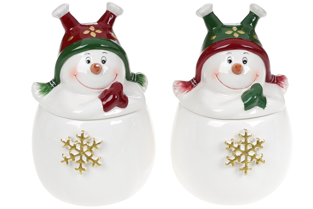 Фігурна кришка виконана у формі сніговика з хитрими вічками та пустотливою посмішкою. З таким посудом святковий настрій забезпечений! Керамічна ємність із золотою сніжинкою; кришка з яскравим декором. Якісне глазування створює ідеально гладку блискучу поверхню.
