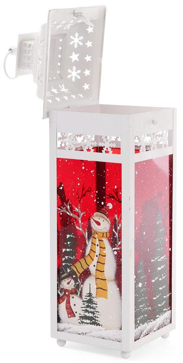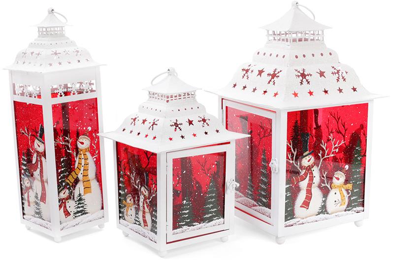 Декоративный фонарь-подсвечник Снеговики для создания новогодней атмосферы, Металлический белый корпус, стеклянные стенки с декором - новогодние снеговики