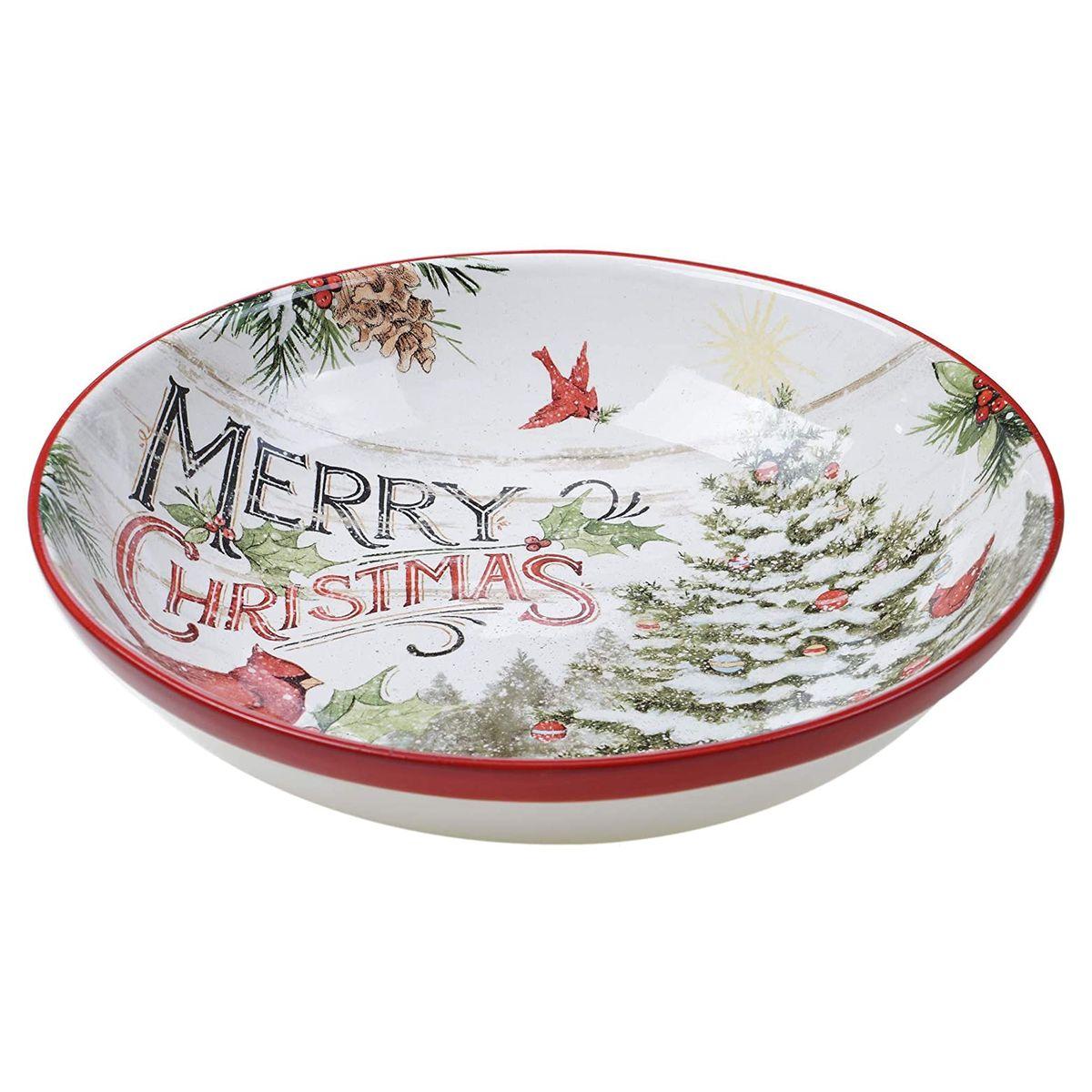 Велика керамічна миска, в якій можна подавати салат чи пасту, прикрашена чудовою різдвяною композицією. На білому тлі красується вбрана іграшками ялина, яку облюбували червоні пташки кардинали, які не поступаються своїм яскравим виглядом лісовій красуні.