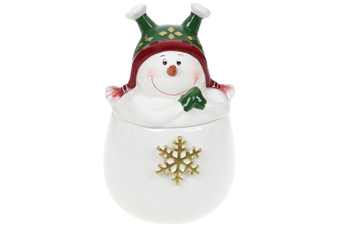 Фігурна кришка виконана у формі сніговика з хитрими вічками та пустотливою посмішкою. З таким посудом святковий настрій забезпечений! Керамічна ємність із золотою сніжинкою; кришка з яскравим декором. Якісне глазування створює ідеально гладку блискучу поверхню.