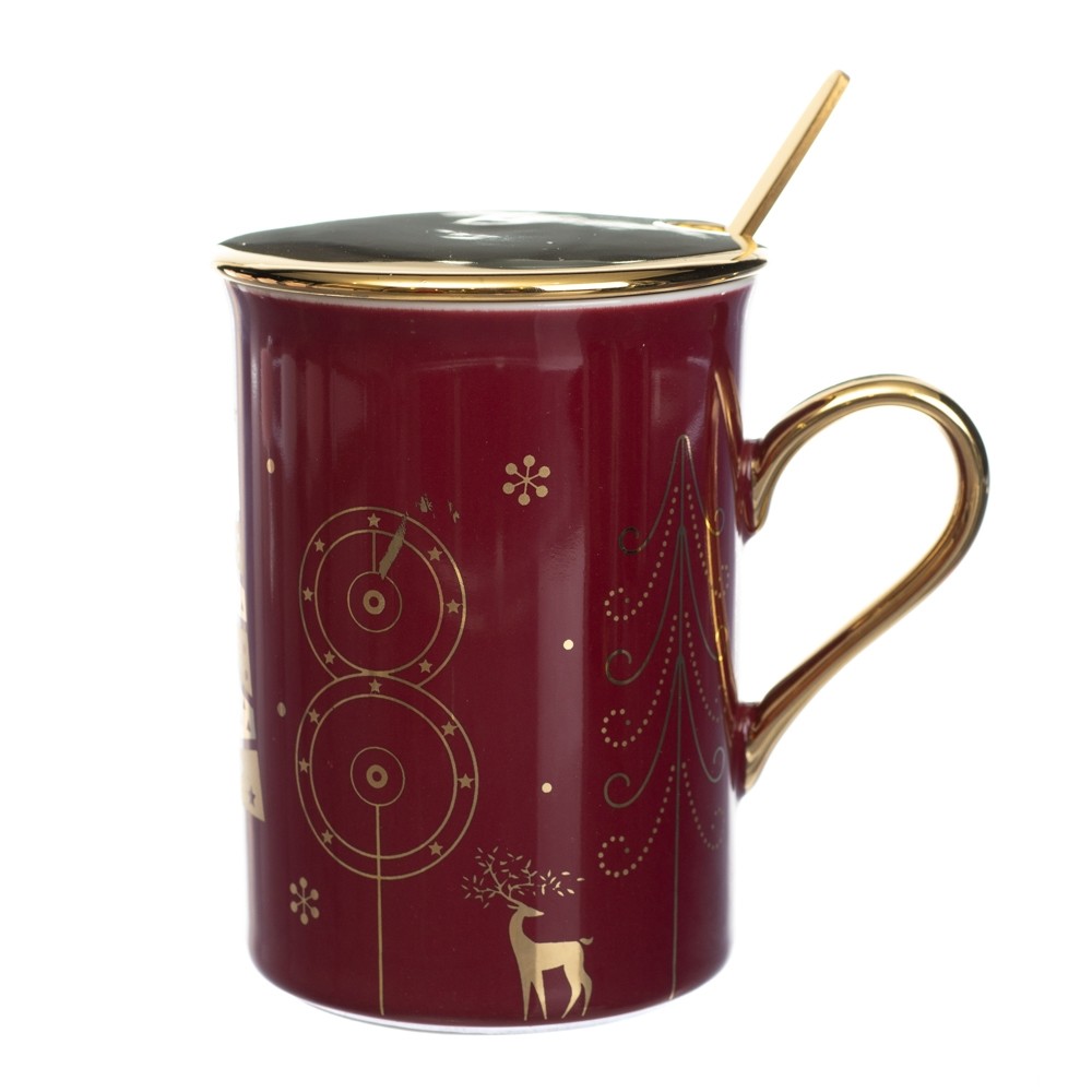 Новогодняя чашка с ложкой и крышкой бордовый 300 мл