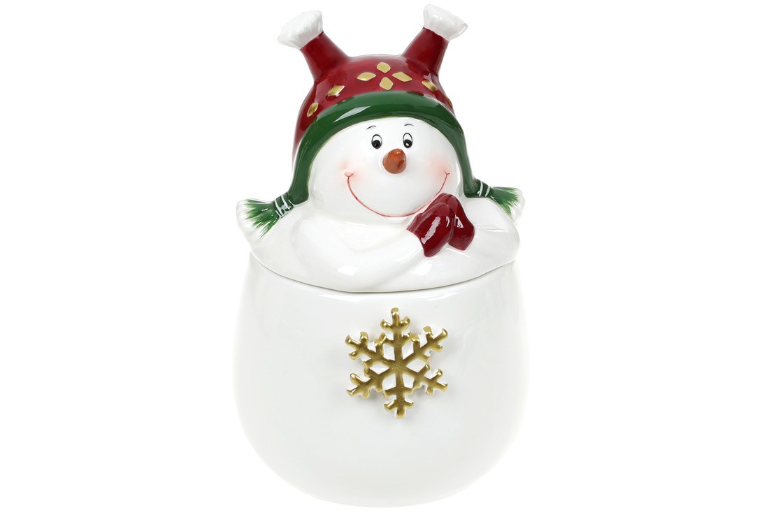 Фигурная крышка выполнена в форме снеговика с хитрыми глазками и озорной улыбкой. С такой посудой праздничное настроение обеспечено! Керамическая емкость с золотой снежинкой; крышка с ярким декором. Качественная глазировка создает идеально гладкую блестящую поверхность.