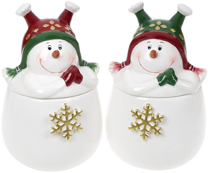 Фігурна кришка виконана у формі сніговика з хитрими вічками та пустотливою посмішкою. З таким посудом святковий настрій забезпечений! Керамічна ємність із золотою сніжинкою; кришка з яскравим декором. Якісне глазування створює ідеально гладку блискучу поверхню.