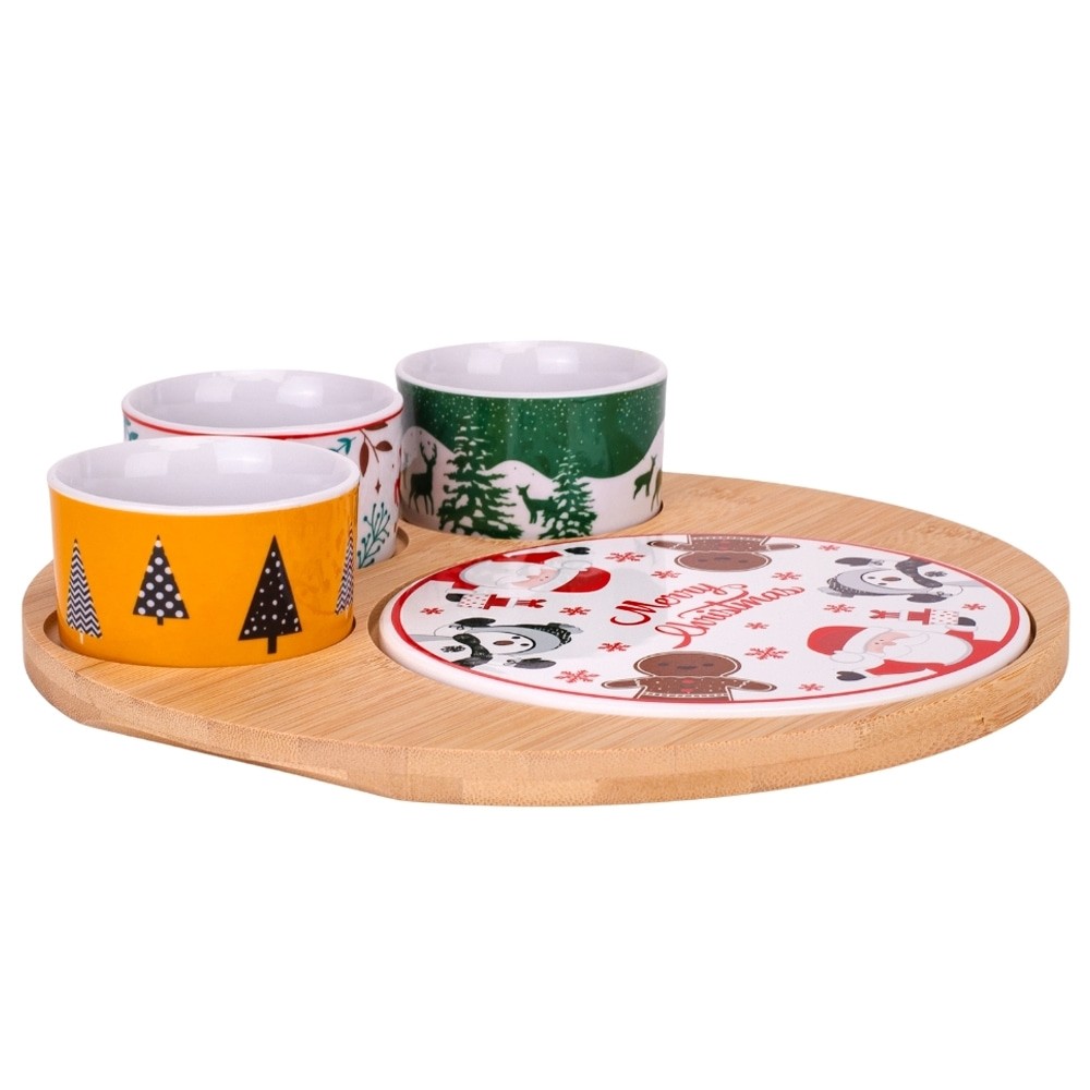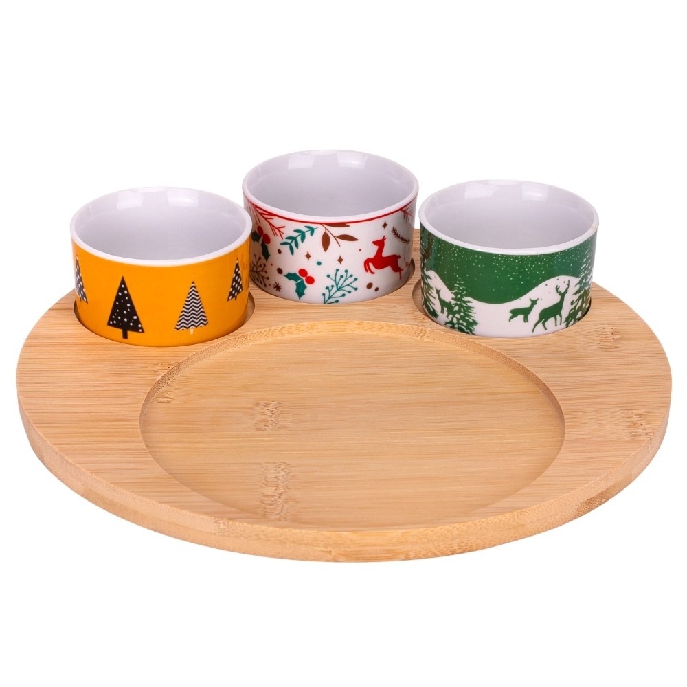 Бамбуковая основа не только придает эстетическому шарму, но и обеспечивает устойчивость и комфорт при подаче блюд. Этот набор станет идеальным дополнением к вашему праздничному столу, придавая ему элегантность и тепло. Он отлично подходит для сервировки рождественских угощений, закусок или сладостей, делая ваши блюда еще более привлекательными.