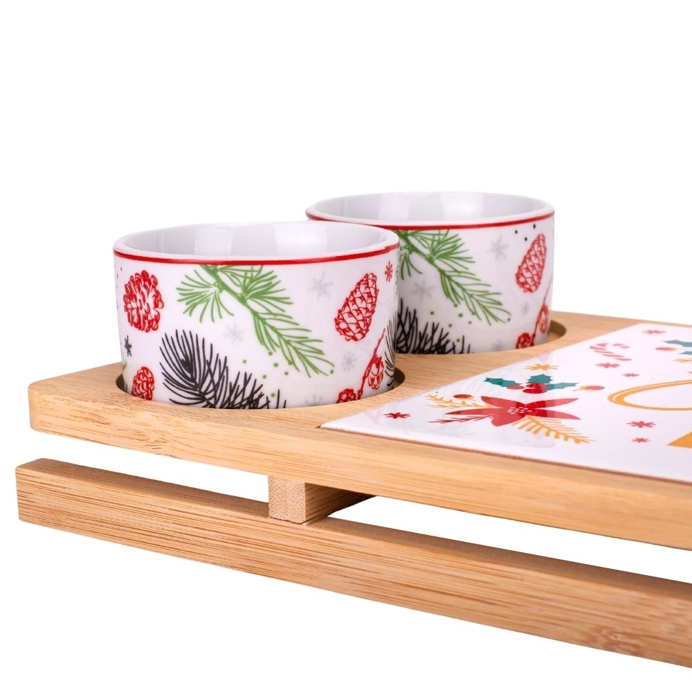 Набор керамических пиал с дощечкой на бамбуковой основе в виде саней – это стильный и оригинальный сервировочный комплект, сочетающий эстетику и практичность. Керамические пиалы и дощечка оформлены в праздничном дизайне, а удобное бамбуковое основание обеспечивает надежность и комфорт во время сервировки.