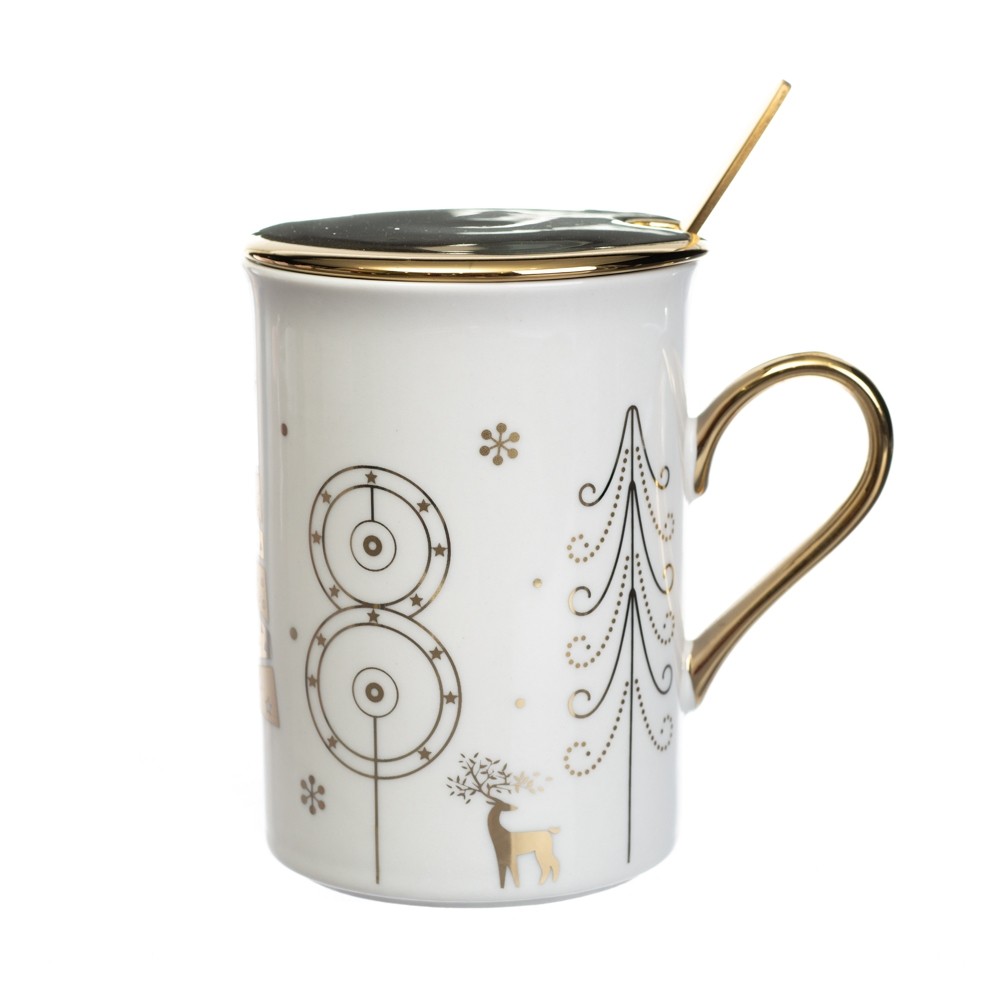 Новорічна чашка з ложкою і кришкою біла 300 мл