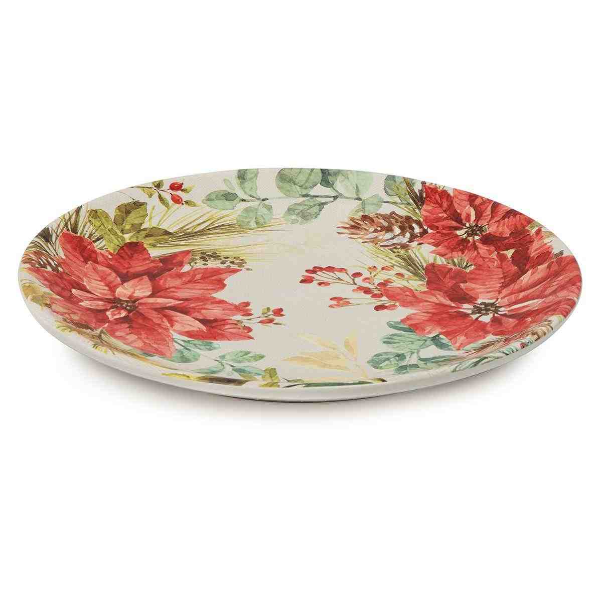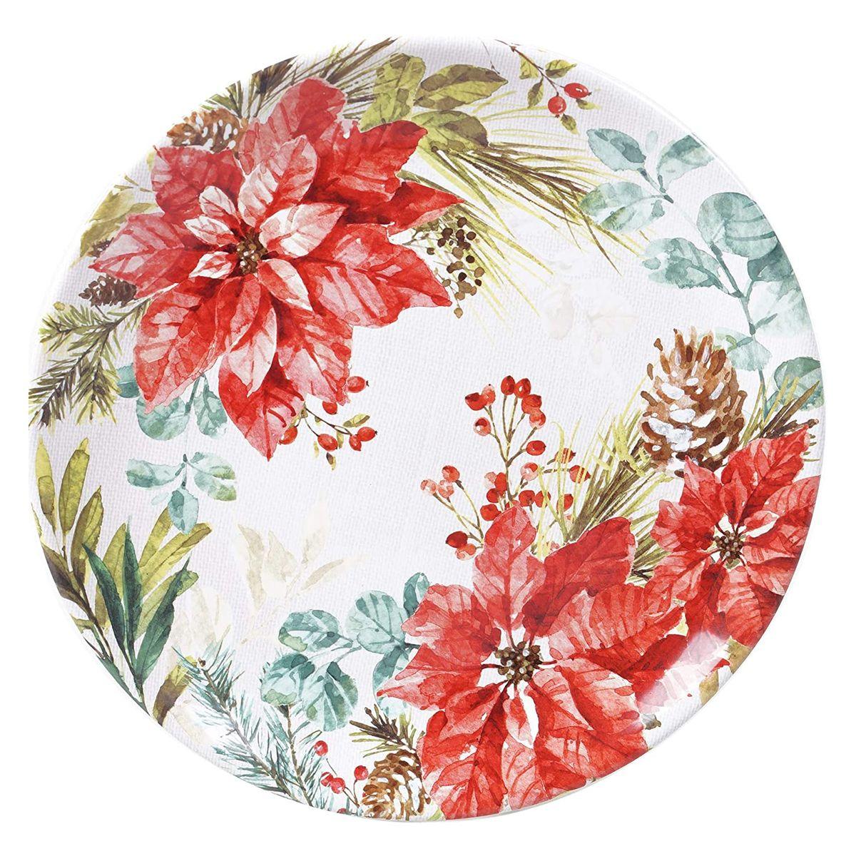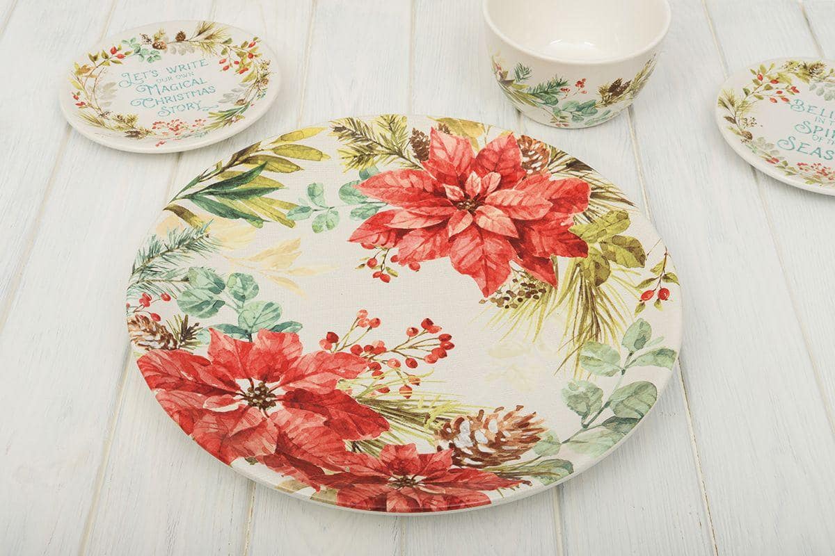 Головним акцентом у дизайні, розробленому популярною американською художницею Лізою Аудит для бренду Certified International, стала яскраво-червона квітка пуансеттії, яку оточує ніжна новорічна композиція з ялин, ягід, шишок та інших рослин. Квітковий візерунок, виконаний у гарній акварельній техніці, розміщений на білому тлі домотканого полотна.