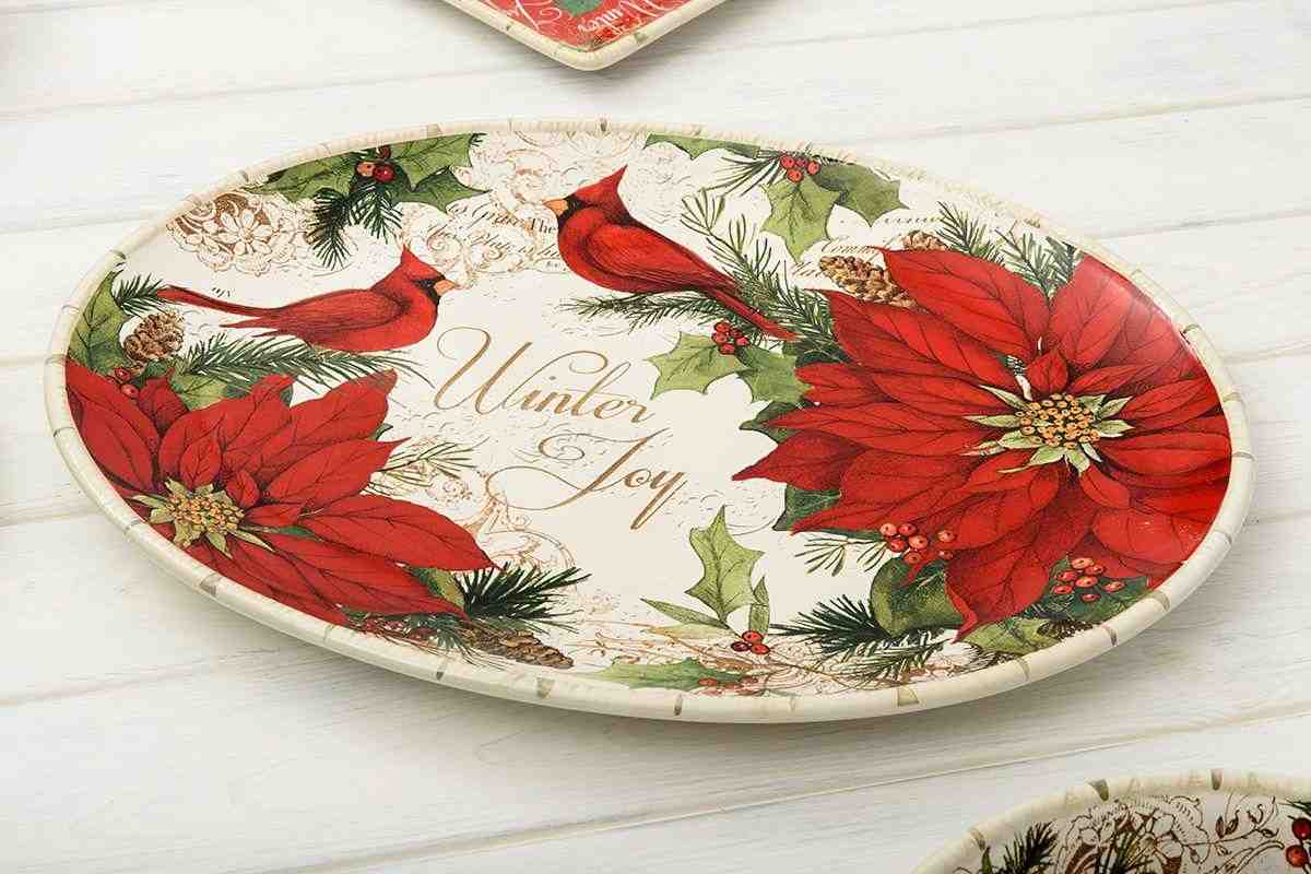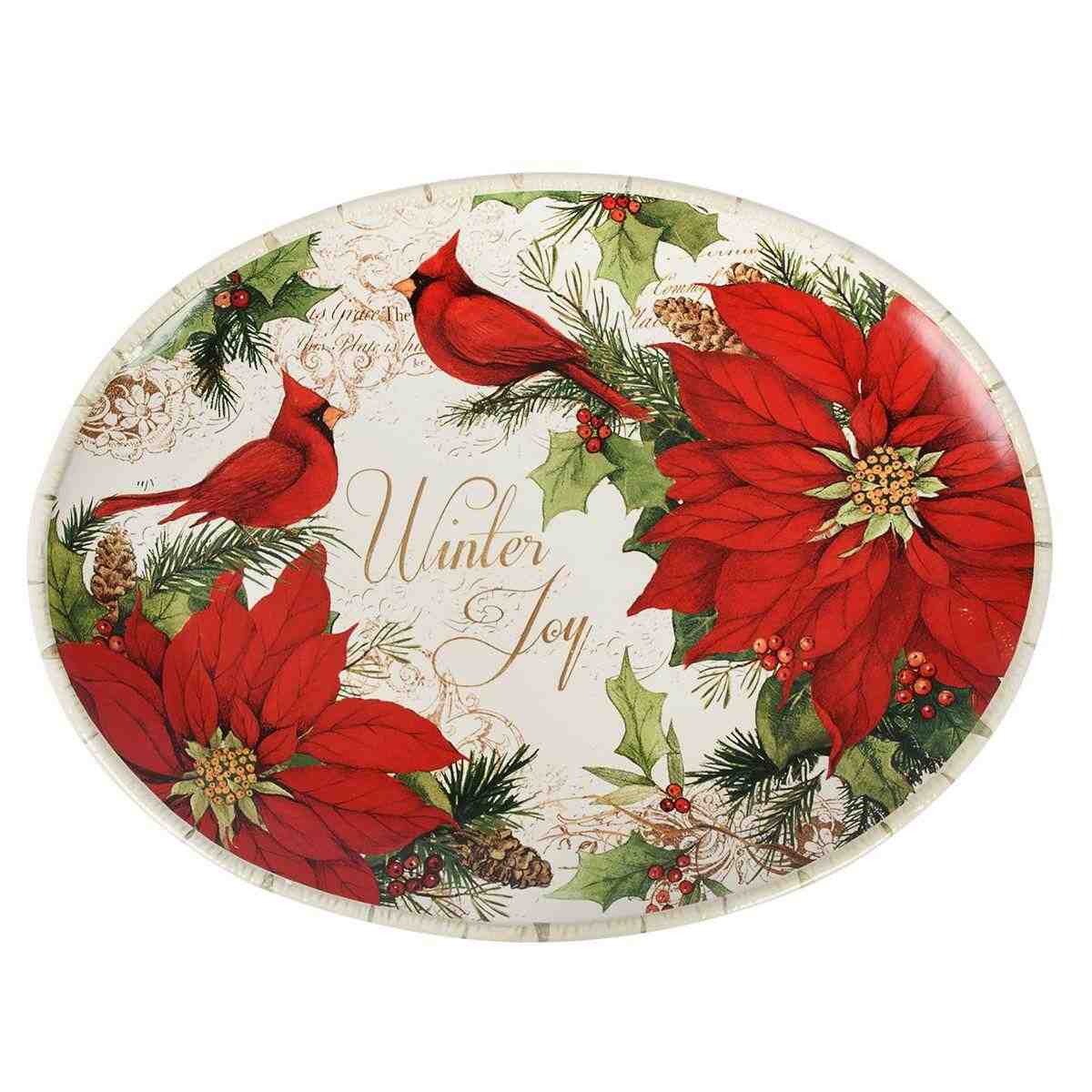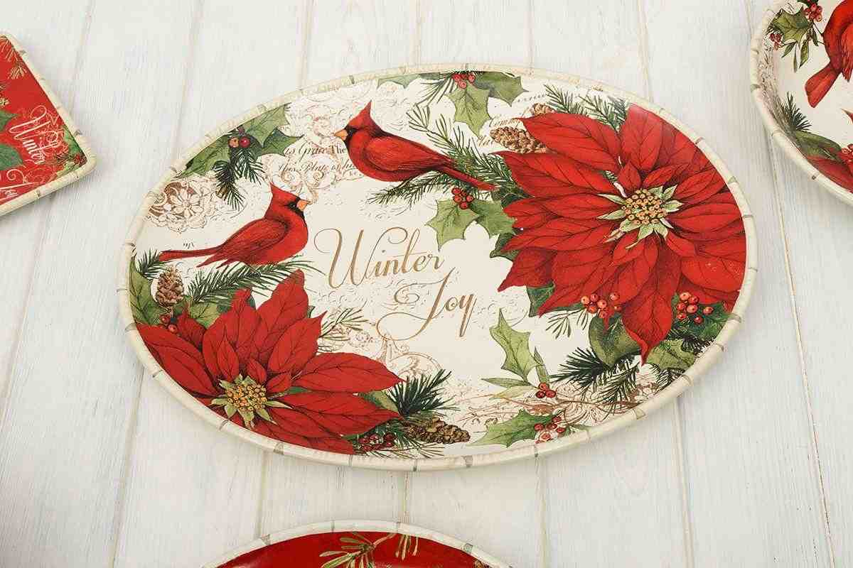 Білий фон керамічної страви з вінтажними візерунками прикрашає гарна різдвяна композиція, що складається з пишних пуансеттій, розкішну красу яких делікатно підкреслюють ялинові гілки, листя падубу з ягодами та два яскраво-червоні кардинали. Кайма овального виробу, центром якого написано Winter Joy («Зимова радість»), зроблена у вигляді візерунка березової кори.