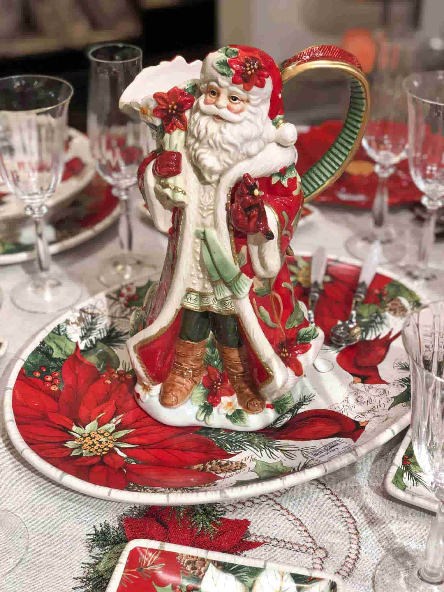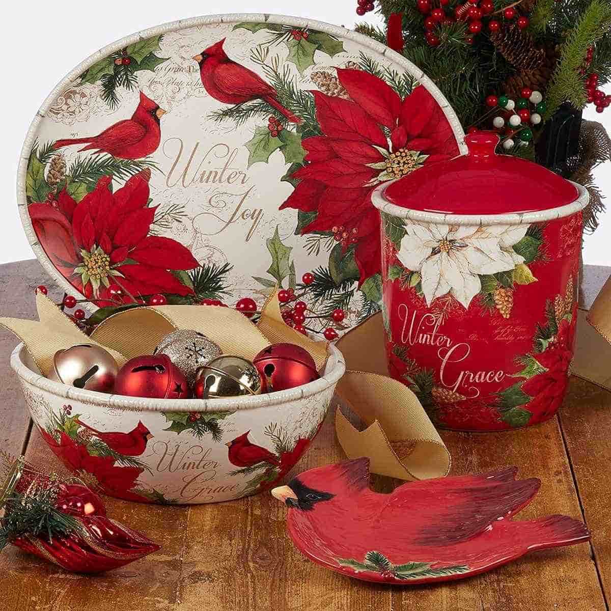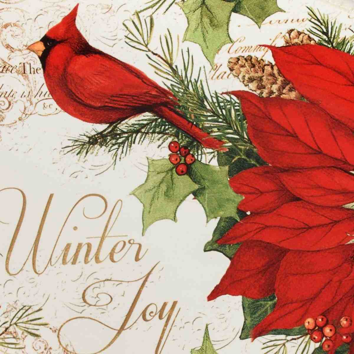 Білий фон керамічної страви з вінтажними візерунками прикрашає гарна різдвяна композиція, що складається з пишних пуансеттій, розкішну красу яких делікатно підкреслюють ялинові гілки, листя падубу з ягодами та два яскраво-червоні кардинали. Кайма овального виробу, центром якого написано Winter Joy («Зимова радість»), зроблена у вигляді візерунка березової кори.