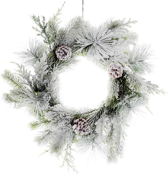 Новорічний засніжений вінок з шишками Сніговик 34 см