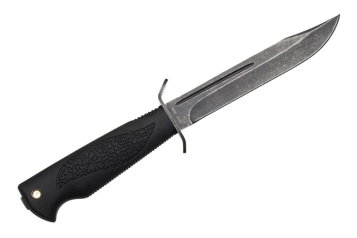 Ніж Армійський (сталь 440 C) - нескладний ніж, виконаний за мотивами легендарної "фінки". Клинок ножа виготовлений із сталі 440С – корозійностійка хромиста сталь, відома своєю високою зносостійкістю, міцністю та твердістю. Сталь 440С - досить жорстка сталь, ножі з неї відмінно ріжуть і довго не тупляться. Основна перевага клинка такого типу – це гарна якість різу та висока проникаюча здатність при колючих ударах. Рукоятка ножа виготовлена із сучасних синтетичних матеріалів (типу «гума»). У рукояті передбачено отвір під темляком. Темляк дозволить вивільнити пальці руки для виконання будь-якої роботи, не випускаючи ножа з руки. Вдалий подарунок мисливцеві, любителю активного туризму чи просто практичний подарунок для друга чи колеги.