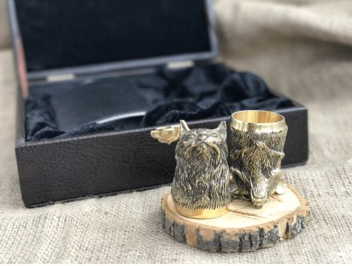 Комплект "Мисливські трофеї" з 2-х чарок із головами тварин, виконаних методом художнього лиття із бронзи. Стаканчик із нержавіючої сталі ємністю 30 мл. Усі чарки ставляться на голову.