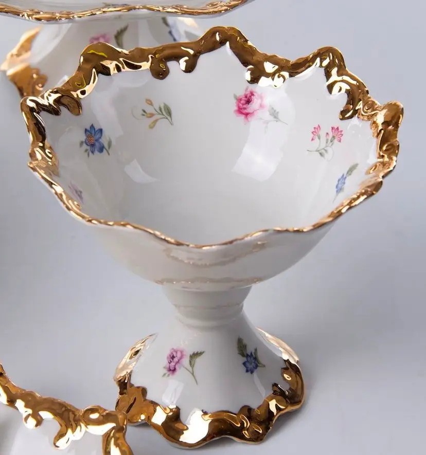 Цукерниця на ніжці діаметром 15,5 см — це вишуканий акцент для вашого святкового або щоденного столу. Білосніжна порцеляна прикрашена ніжними квітковими мотивами та обрамлена розкішною золотою обробкою по краю, яка надає виробу шляхетності й витонченості. Кожна деталь ретельно опрацьована, що робить цукерницю не лише практичною, а й декоративною окрасою інтер’єру.