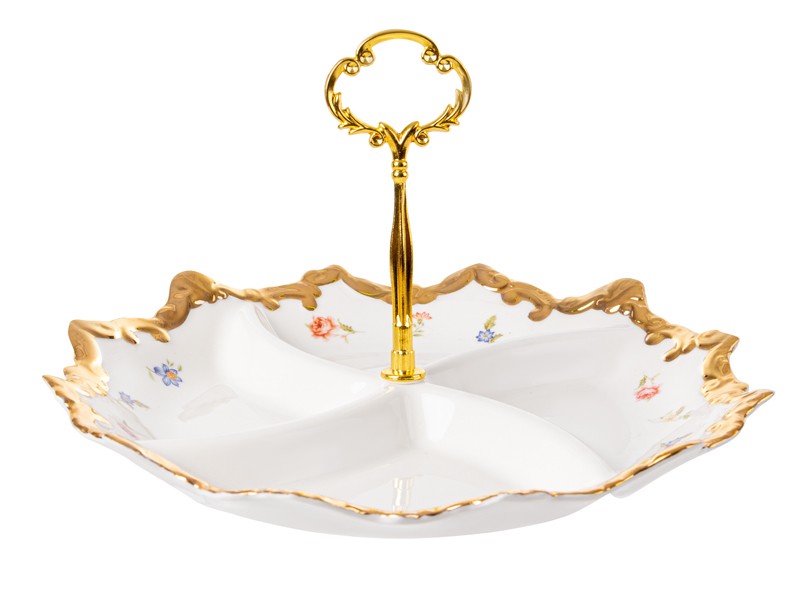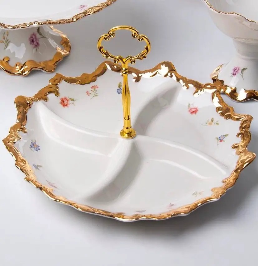 У центрі розташована витончена золота ручка з фігурним верхом — вона не лише прикрашає виріб, а й робить його зручним для перенесення. Чотири окремі секції дозволяють красиво подати закуски, солодощі, фрукти чи горішки, зберігаючи охайність та привабливий вигляд страв.