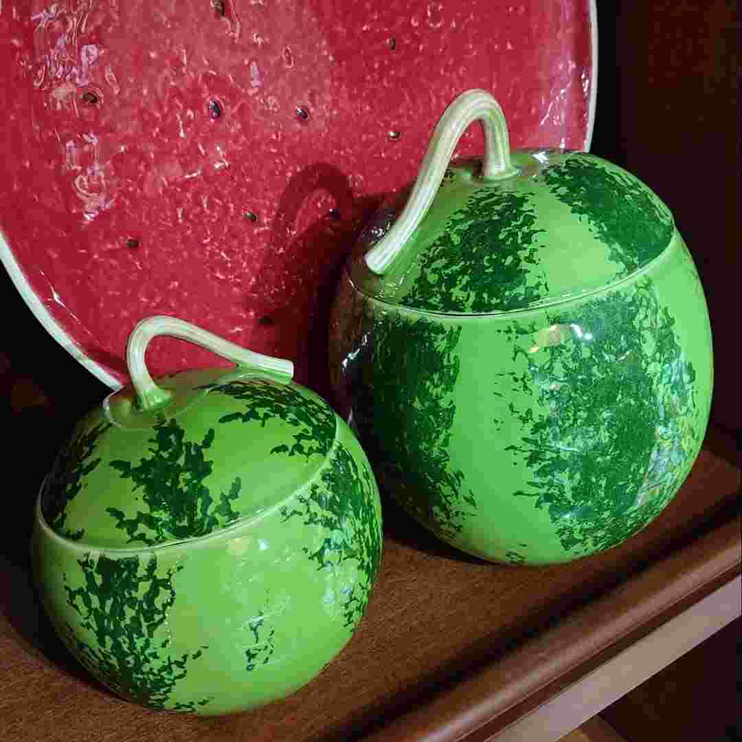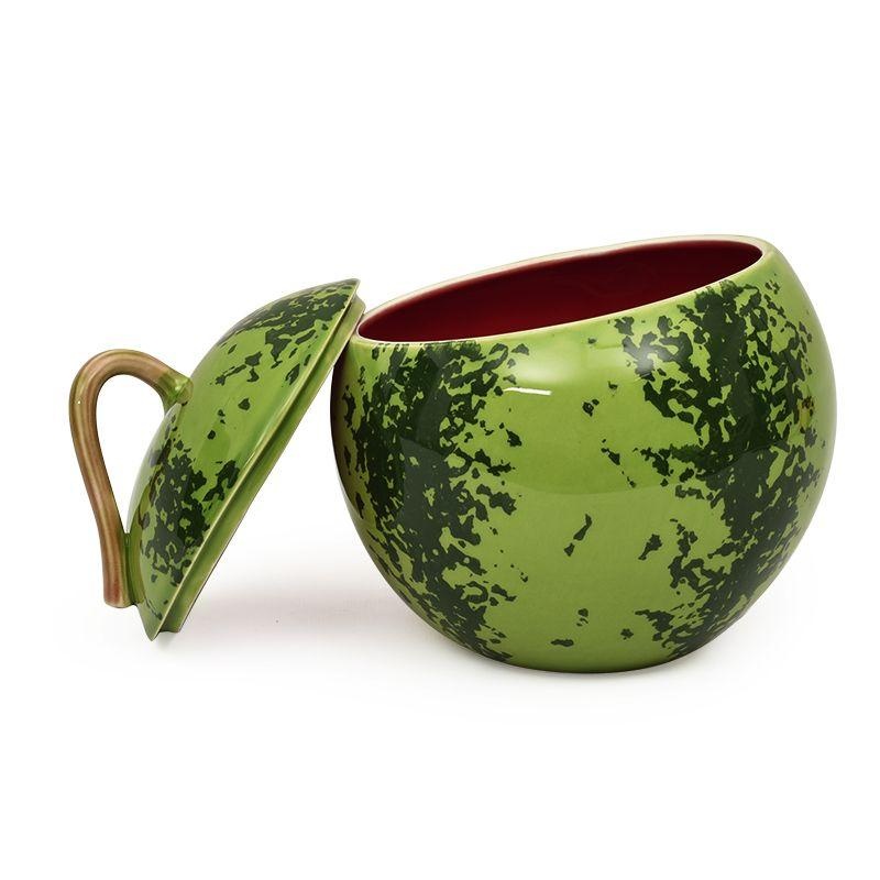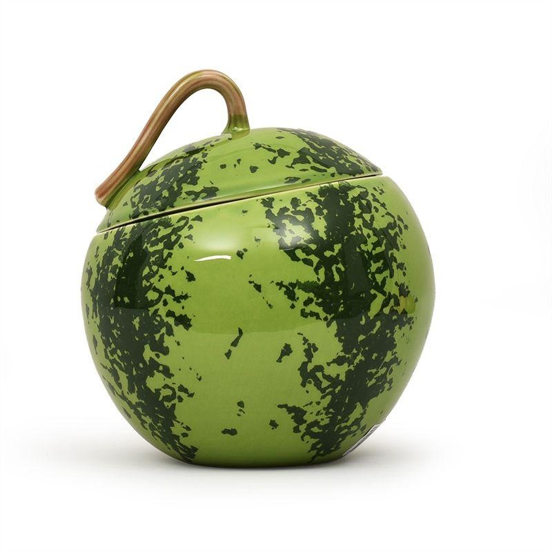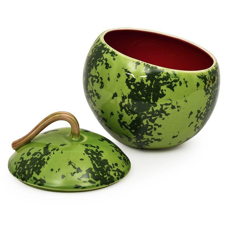 Эта ёмкость среднего размера стилизована под спелый арбуз: её поверхность окрашена в разные зелёные оттенки, которые создают характерные полосы, как у настоящего плода. Ручка на крышке повторяет форму арбузного хвостика, а внутренняя часть изделия выполнена в насыщенном красном цвете.