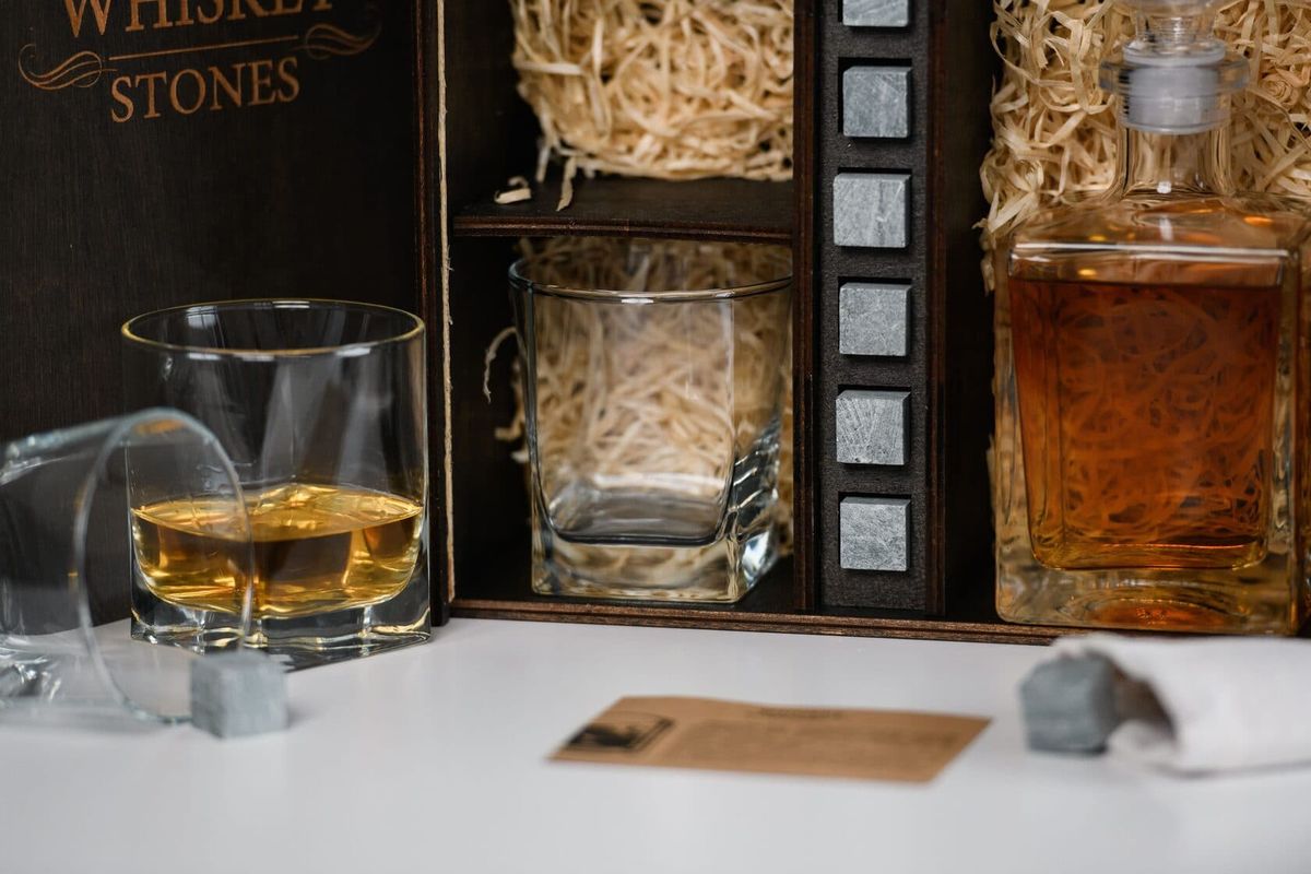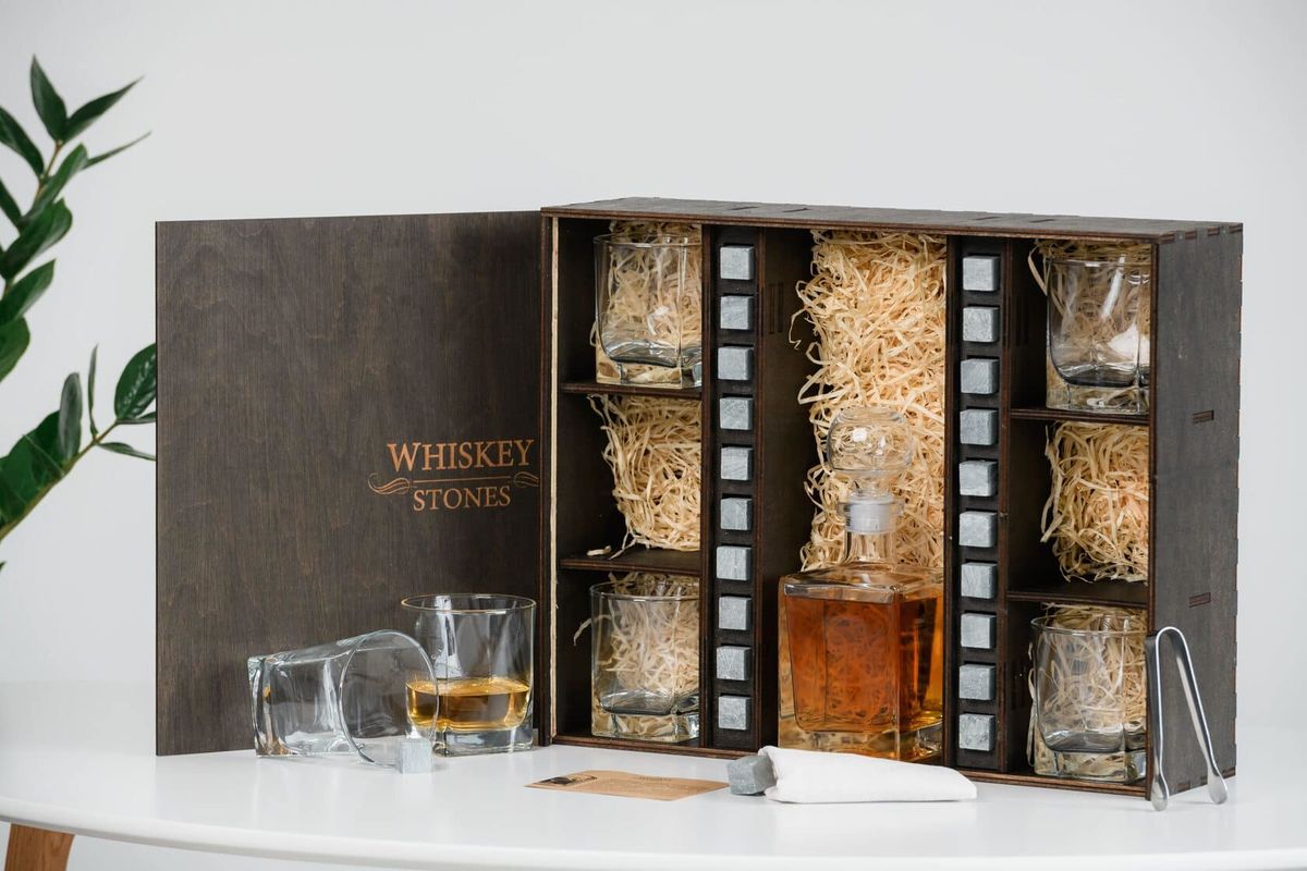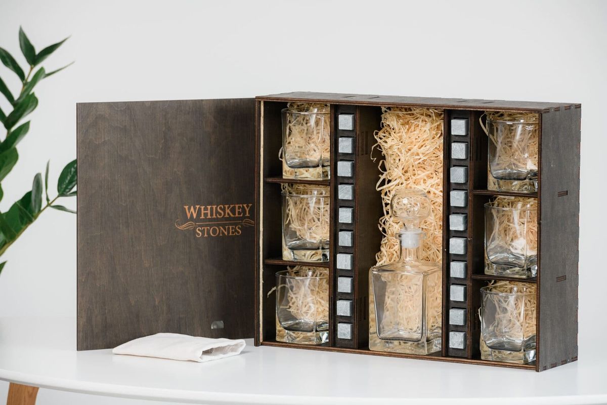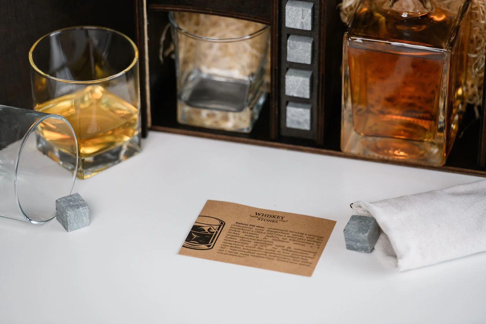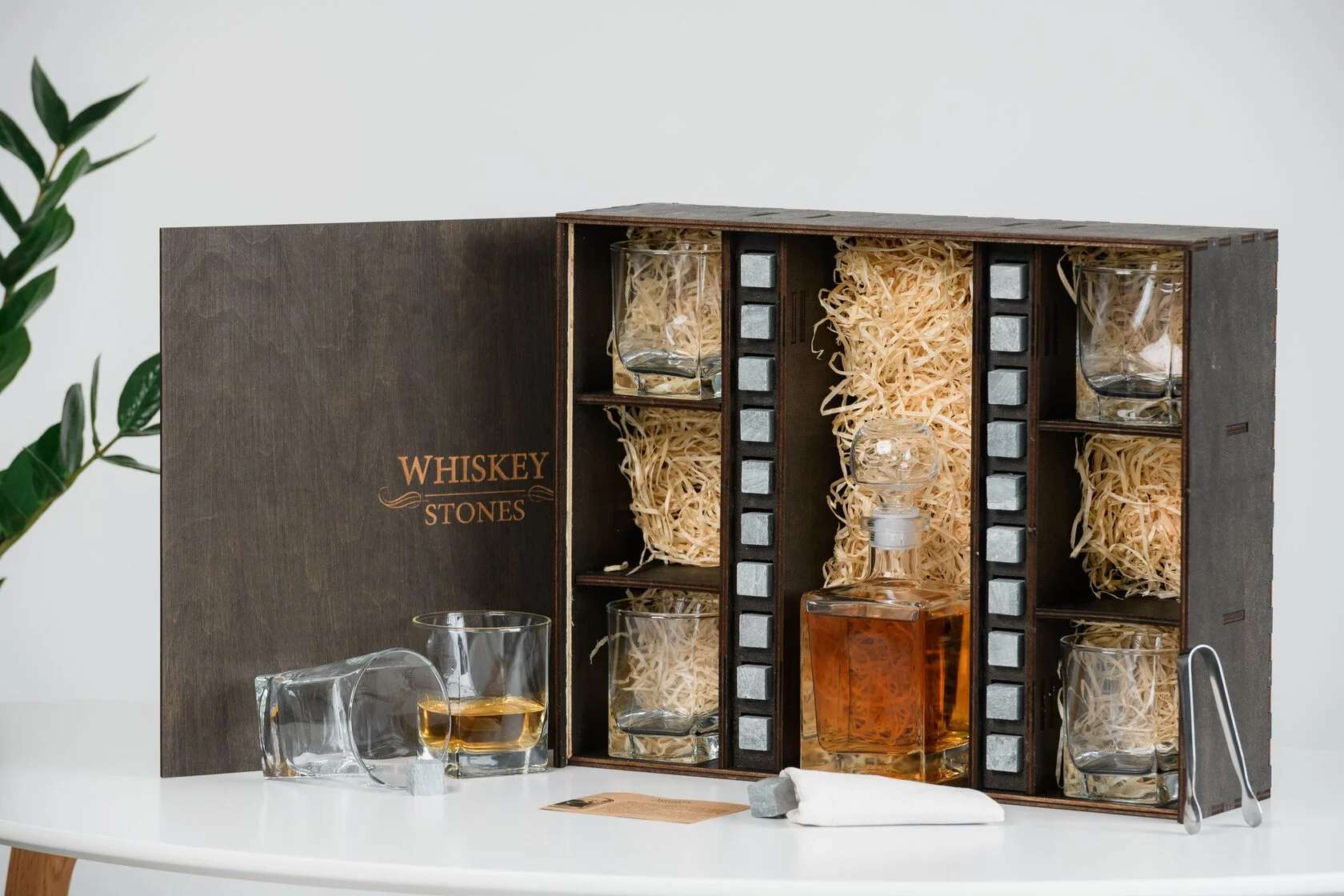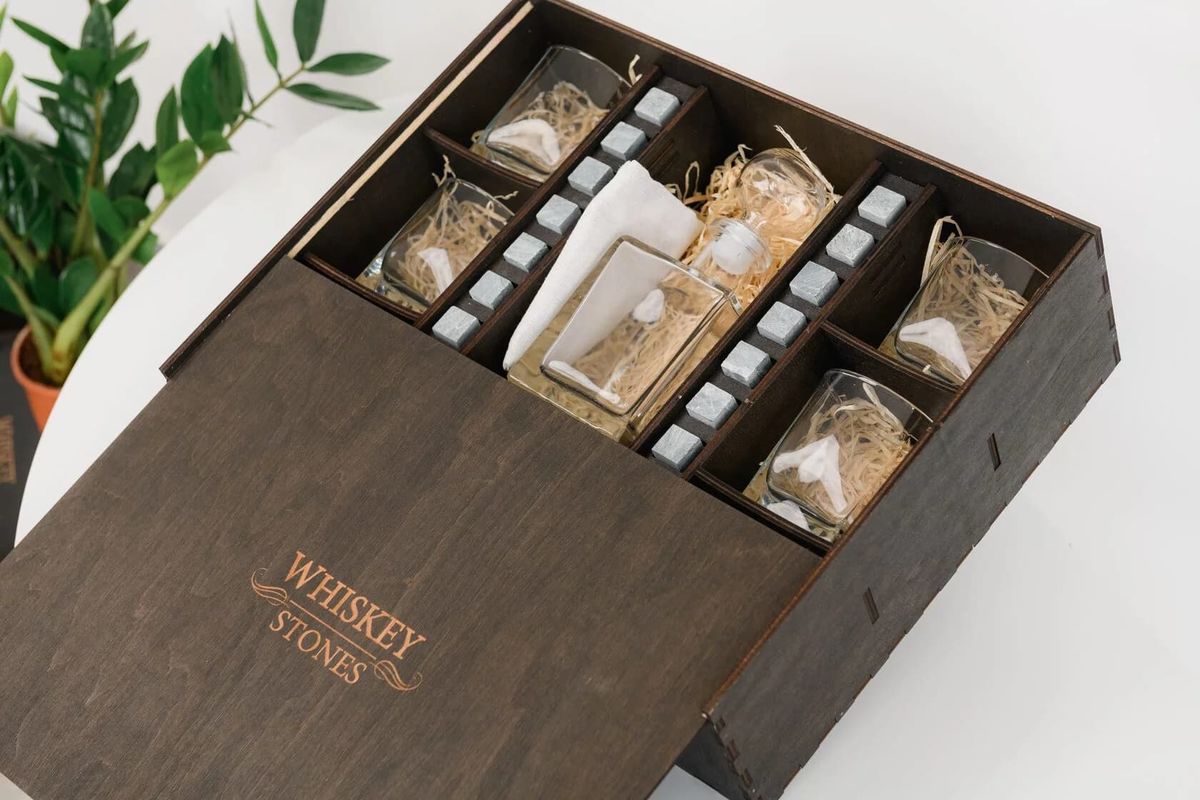 Подарочный набор для виски № 6 Pasabahce Baltic сразу привлекает внимание благодаря стильной деревянной коробке с золотым тиснением и аккуратно организованным внутренним наполнением. Прозрачные стаканы, декантер и камни для виски элегантно размещены в отдельных ячейках, окружённых декоративным наполнителем. Комплект выглядит дорого и солидно — это идеальное решение для тех, кто ценит эстетику в каждой детали.