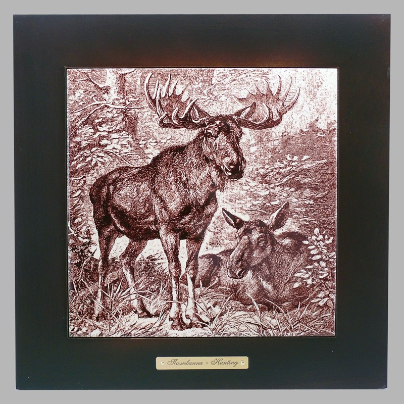 Панно настінне «Полювання. Лось» виготовлена вручну з натурального дерева та кераміки, поверхня її ідеально гладка (деревина прогрунтована). Малюнок нанесений методом холодної деколи якісними європейськими фарбами. Назва серії картини нанесена матовим золотом, а цвяхи йдуть із позолотою. На звороті є вішак. Напис «кераміка, натуральне дерево» виконані матовим золотом. Розмір картини із рамкою 41х41 см, розмір керамічної плитки 33х33 см.