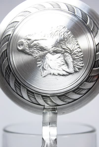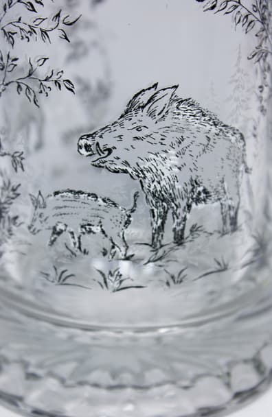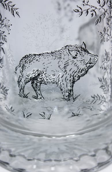 Корпус кружки украшен рисунками диких кабанов в лесу. Рисунок выполнен гравированием и нанесением белой краски. Крышка из пищевого олова украшена макетом головы дикого кабана.