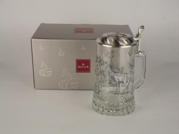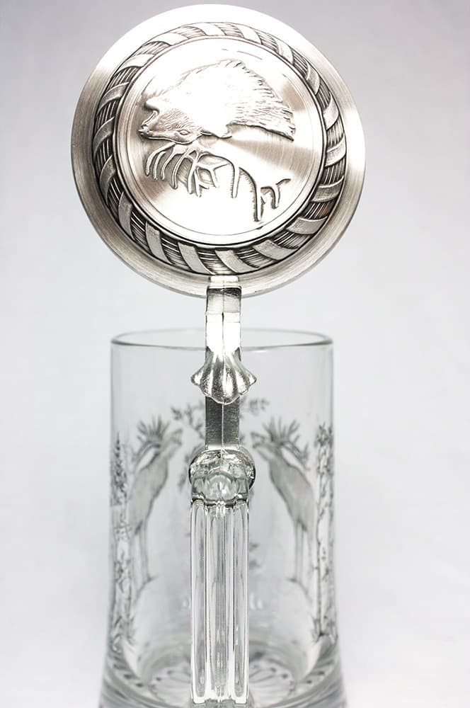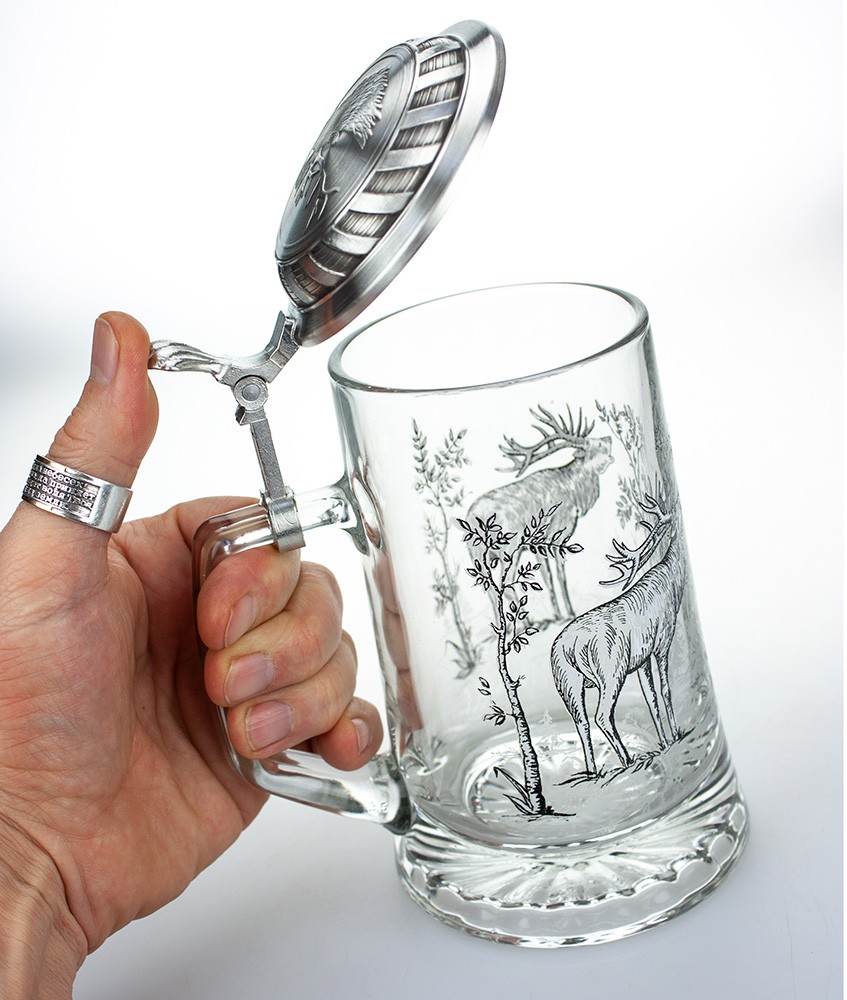Корпус кружки прикрашені малюнками оленів у лісі. Малюнок виконаний гравіюванням та нанесенням білої фарби. Кришка з харчового олова прикрашена макетом голови оленя.