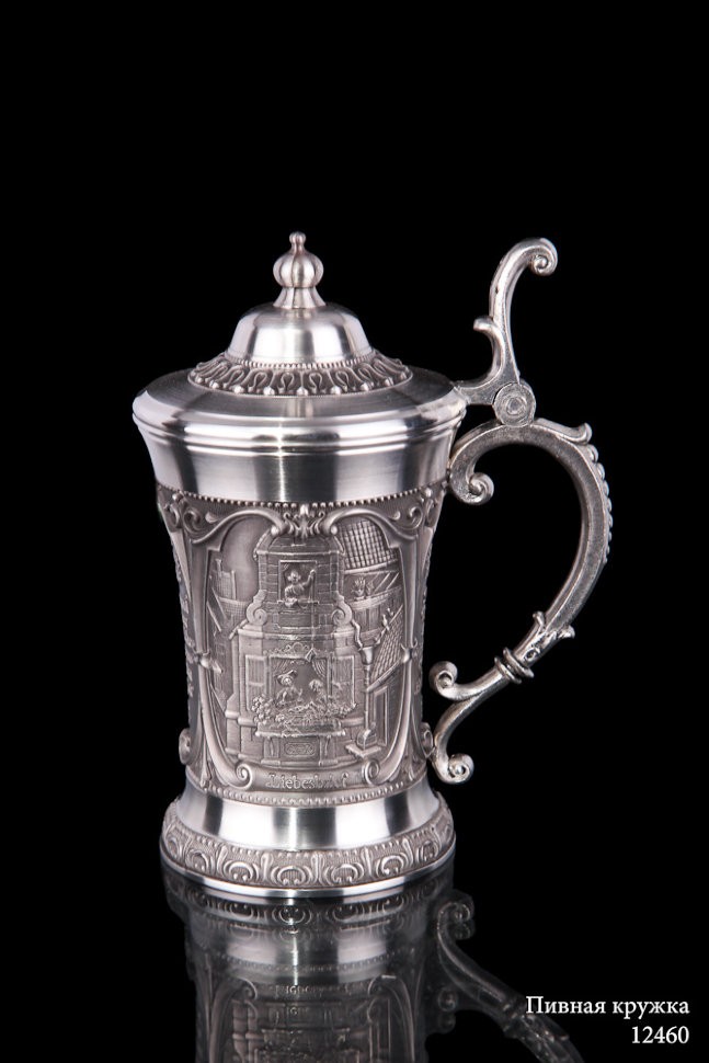 Данная кружка для пива выгодно отличается от большинства продукции подобного типа. Художественная подача, эффект чернения и филигранная работа в совокупности создают полную иллюзию старинного фамильного серебра. Этот эксклюзивный прибор выглядит торжественно и на столе, и просто в интерьере.