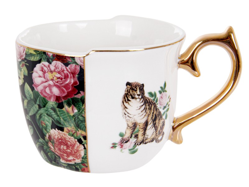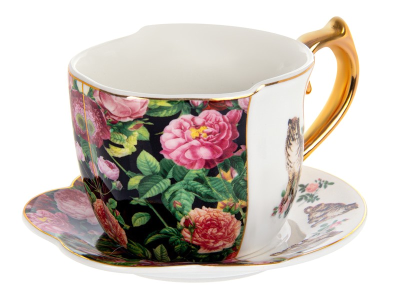 Вишуканий чайний набір з 2 предметів об’ємом 270 мл — це справжнє свято для очей і душі. Глибокий чорний фон вигідно підкреслює яскраві кольори розкішних троянд та зелені, створюючи атмосферу витонченого саду. Золота ручка та облямівка додають композиції шляхетного блиску, перетворюючи кожне чаювання на особливий момент.