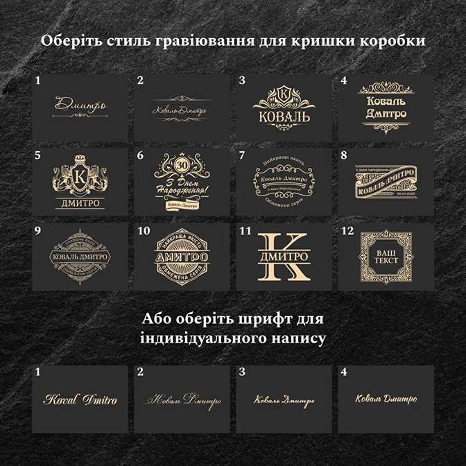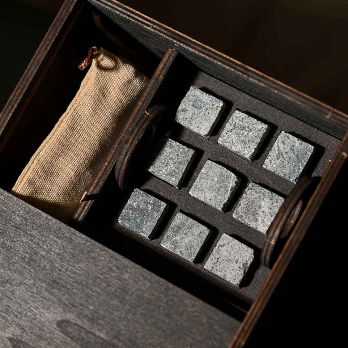 Индивидуальная гравировка — возможна на камнях, крышке коробки, стакане и подставках (отдельно или в комбинации)