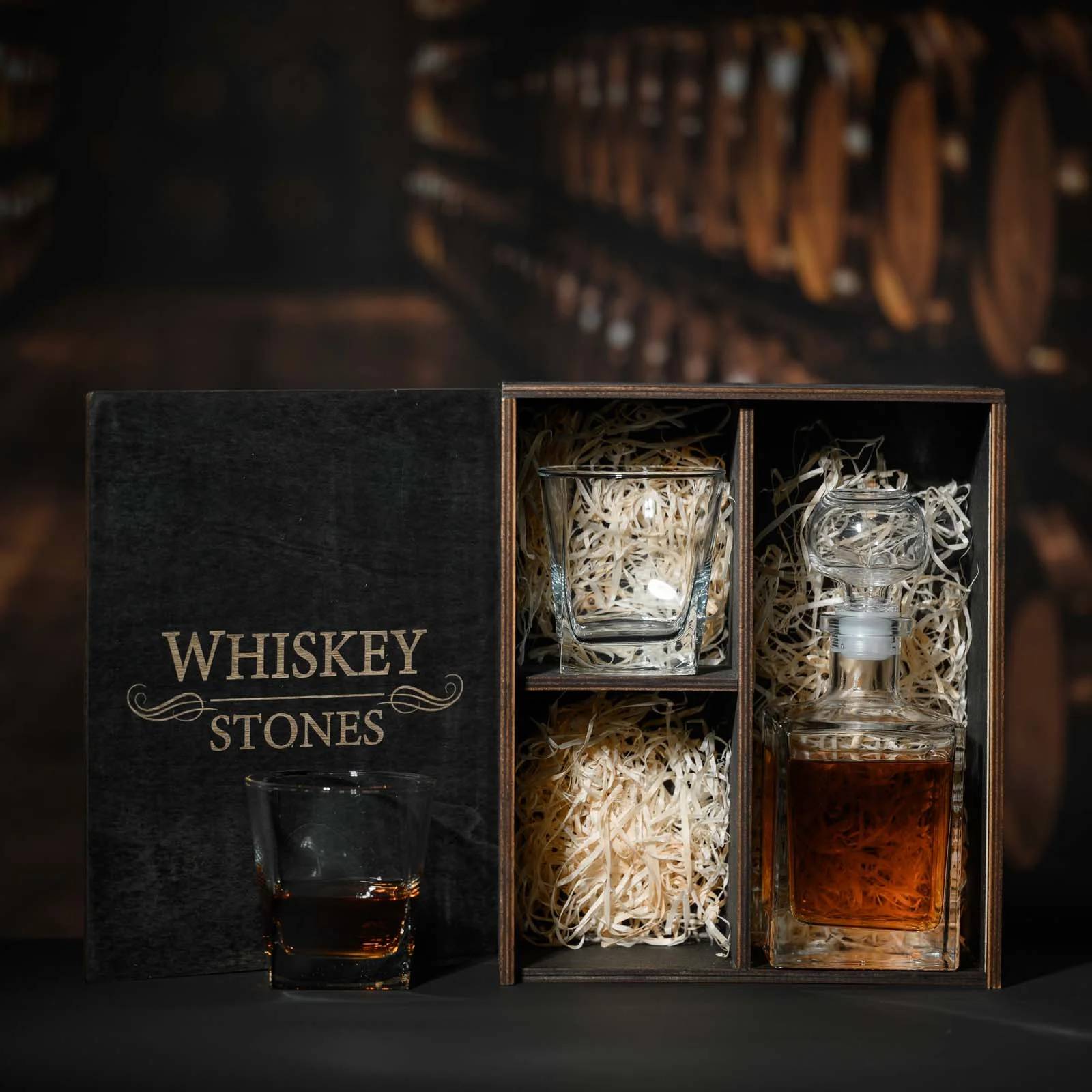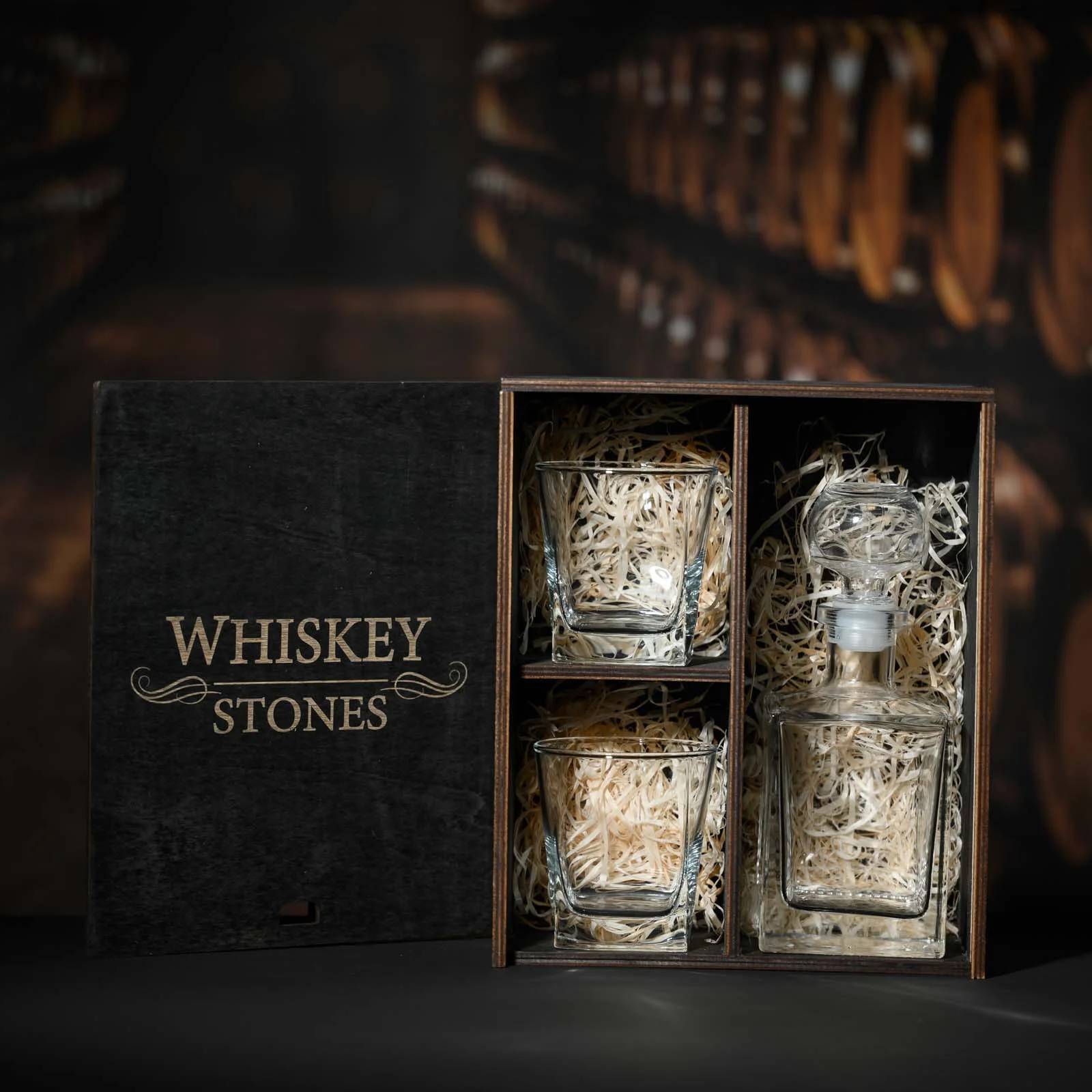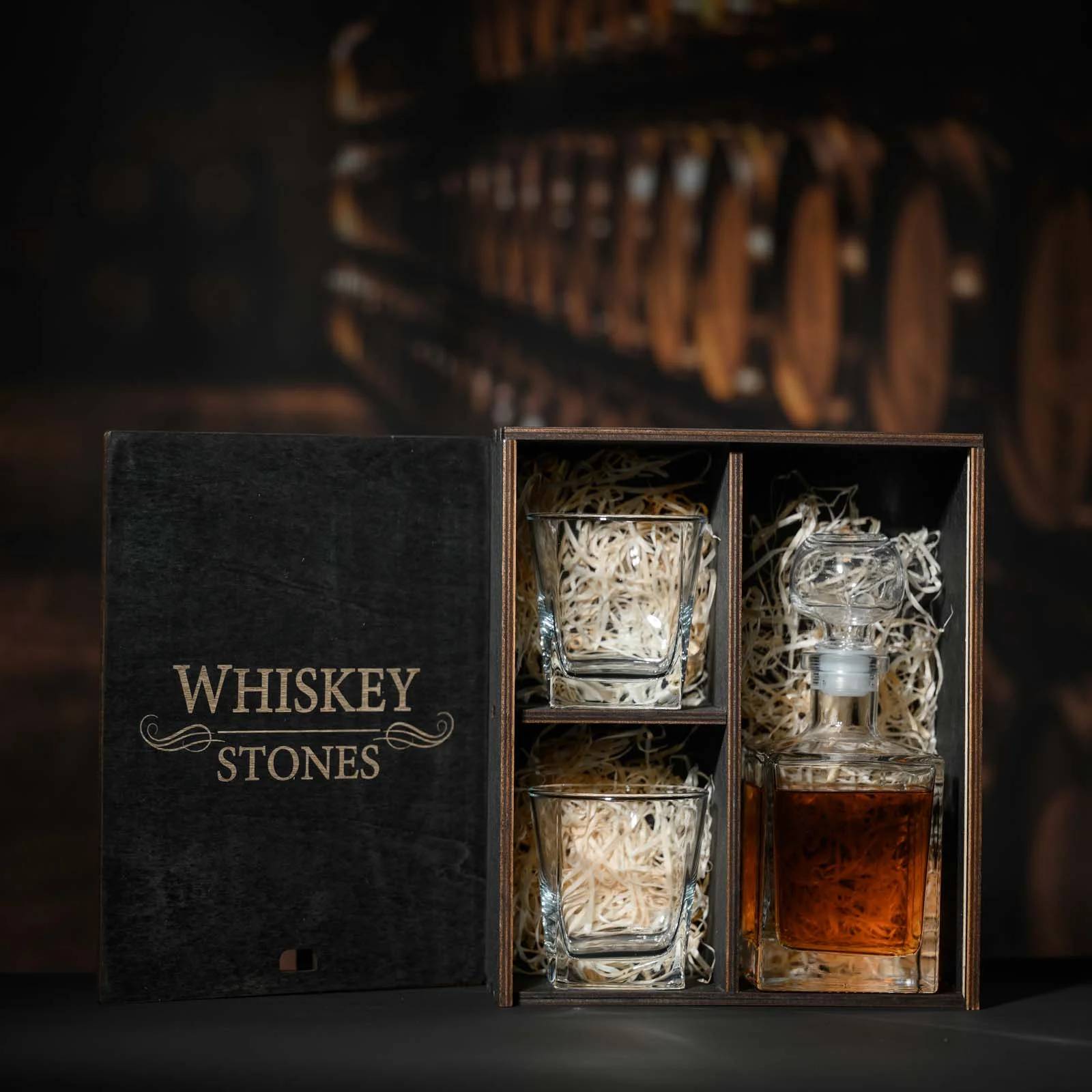 Изысканный подарок, который сочетает в себе эстетику, практичность и атмосферу особого момента. Стеклянные элементы набора — декантер и два стакана — выполнены в классическом стиле и помещены в эффектный деревянный пенал с гравировкой Whiskey Stones. Это не просто упаковка — это часть ритуала.