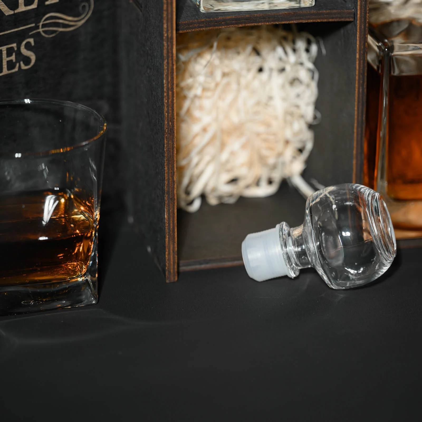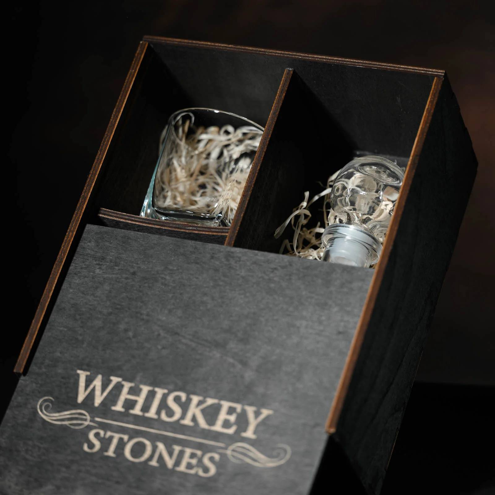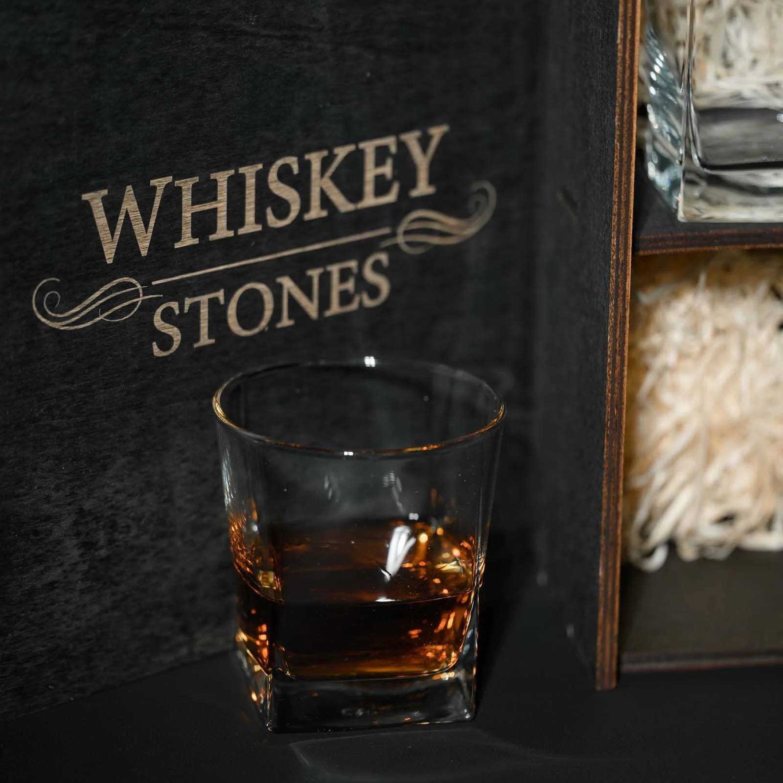 Изысканный подарок, который сочетает в себе эстетику, практичность и атмосферу особого момента. Стеклянные элементы набора — декантер и два стакана — выполнены в классическом стиле и помещены в эффектный деревянный пенал с гравировкой Whiskey Stones. Это не просто упаковка — это часть ритуала.