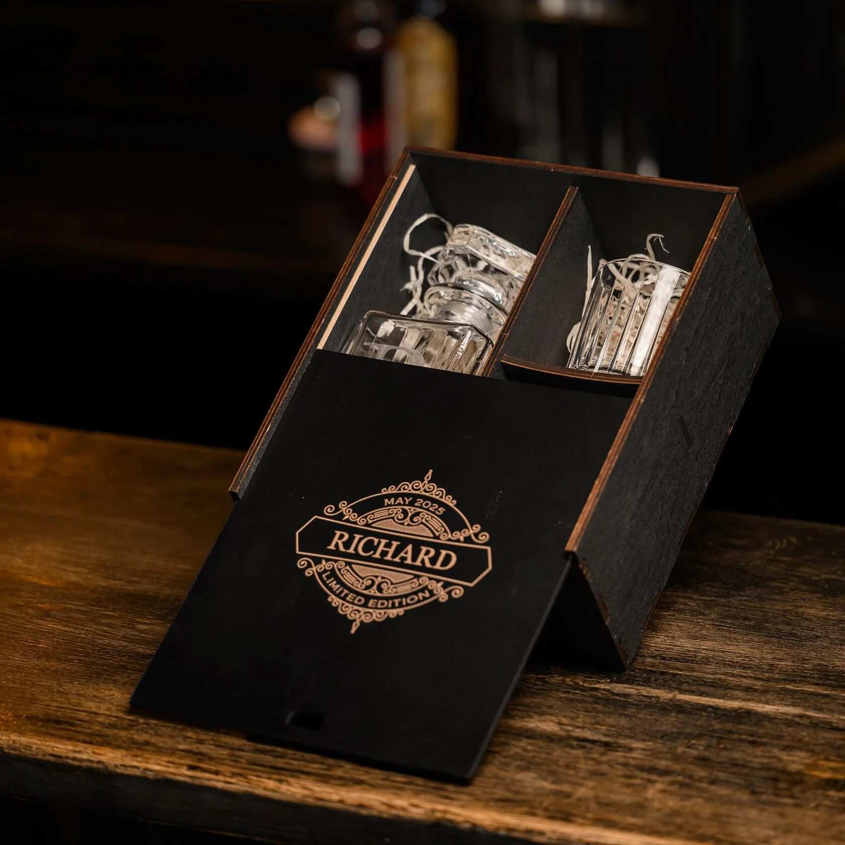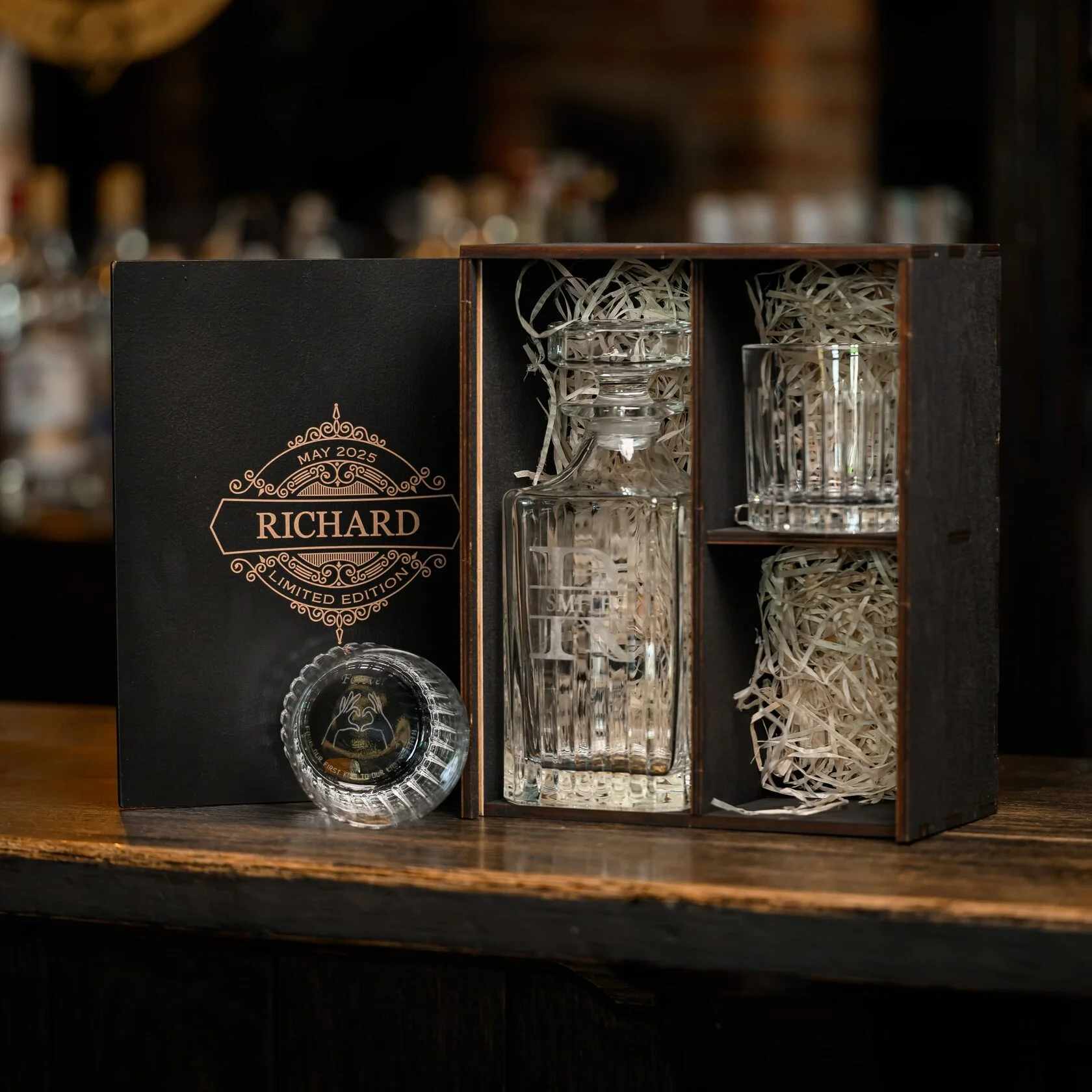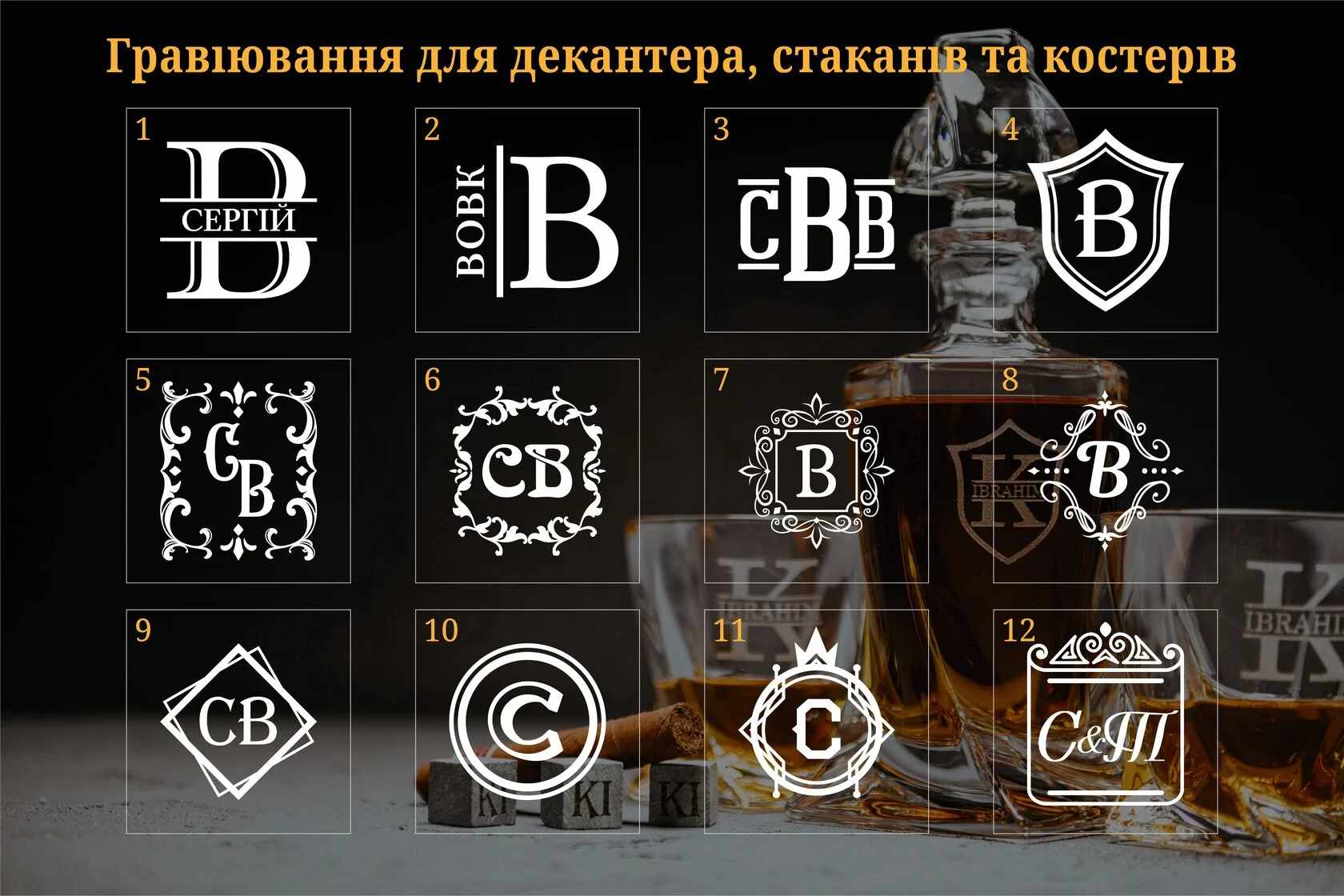 — Индивидуальная гравировка: без гравировки / на крышке коробки/ крышке и стаканах, декантере /, крышке, стаканах, декантере и подставках