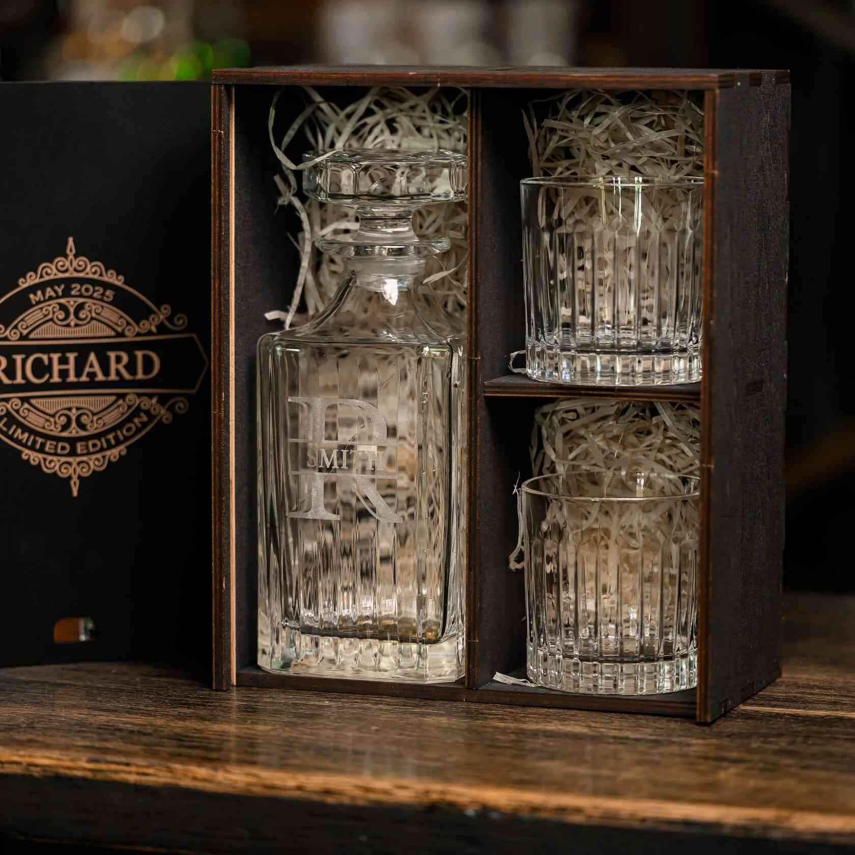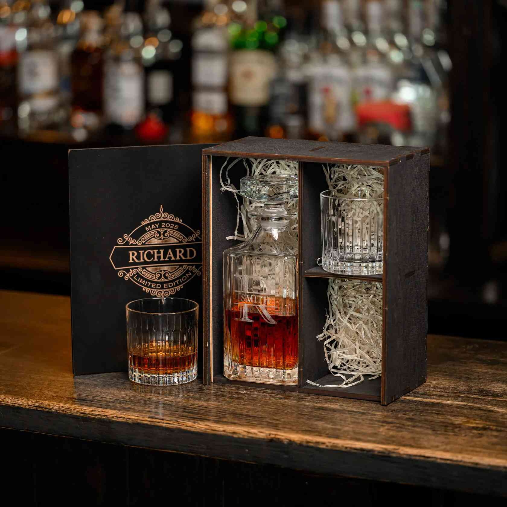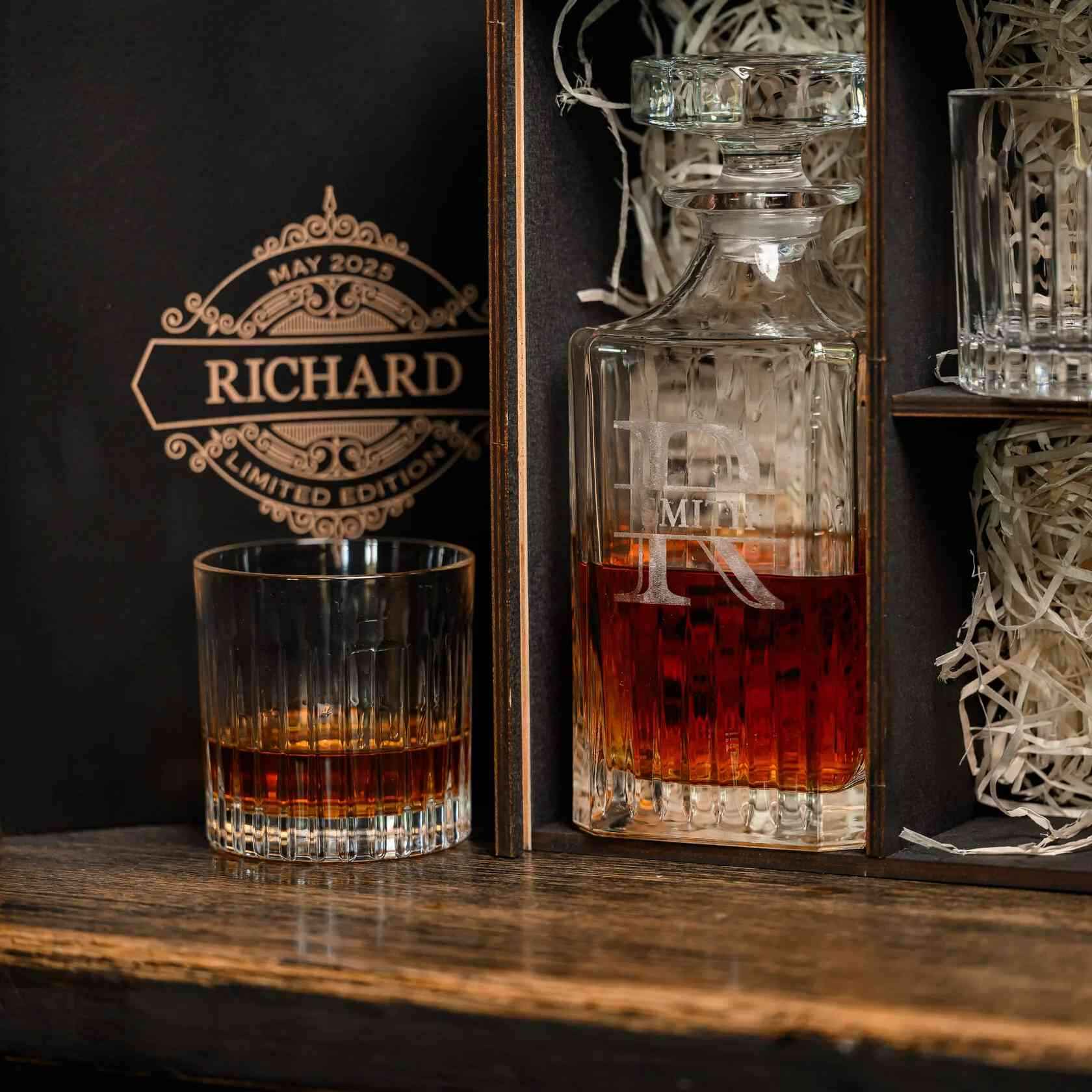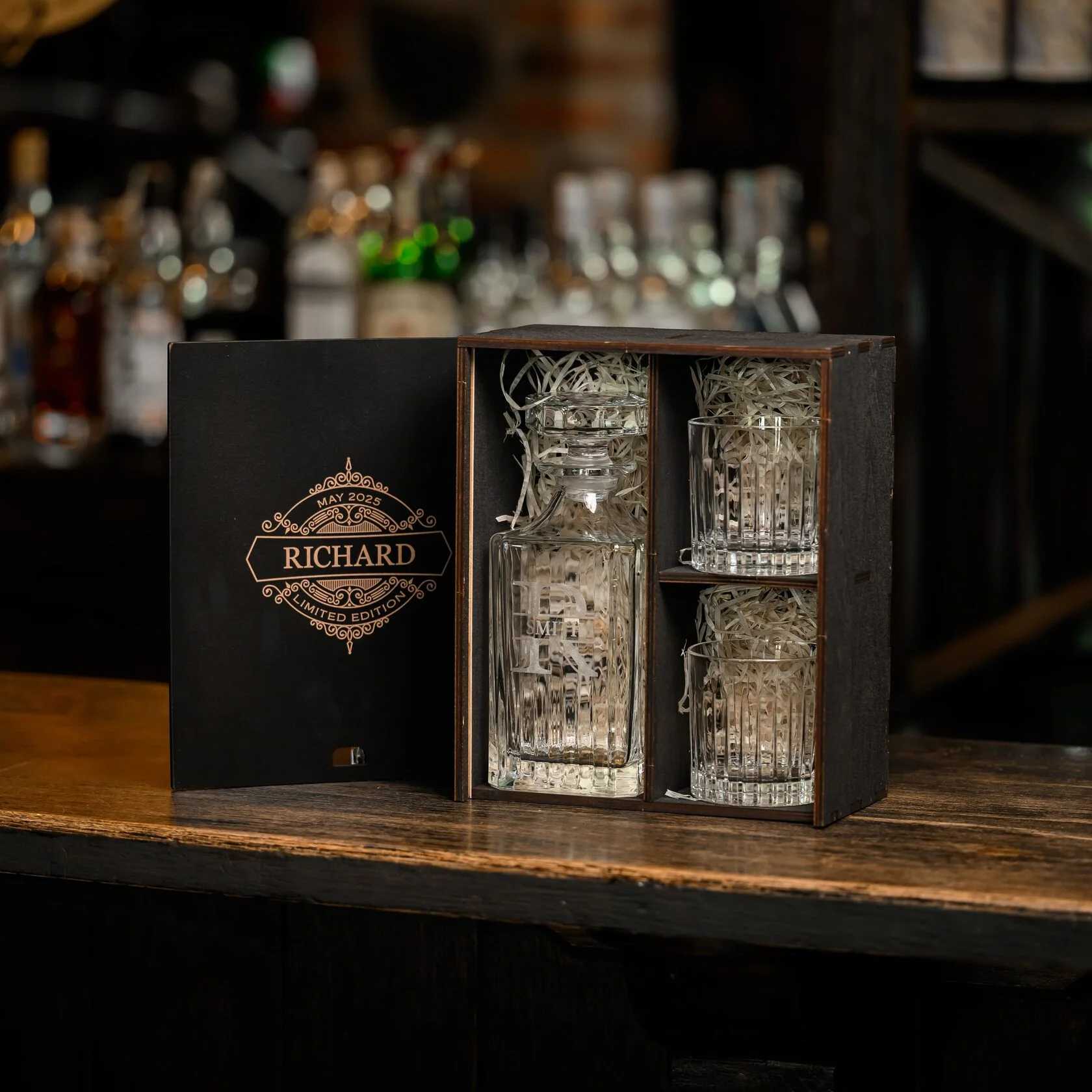 — Индивидуальная гравировка: без гравировки / на крышке коробки/ крышке и стаканах, декантере /, крышке, стаканах, декантере и подставках