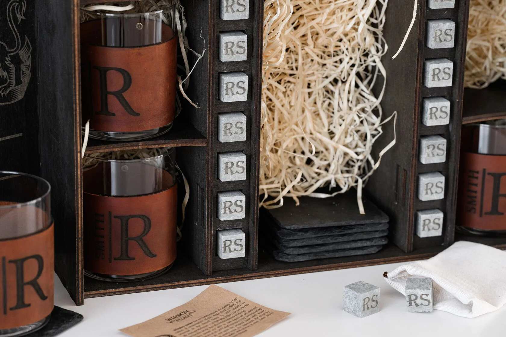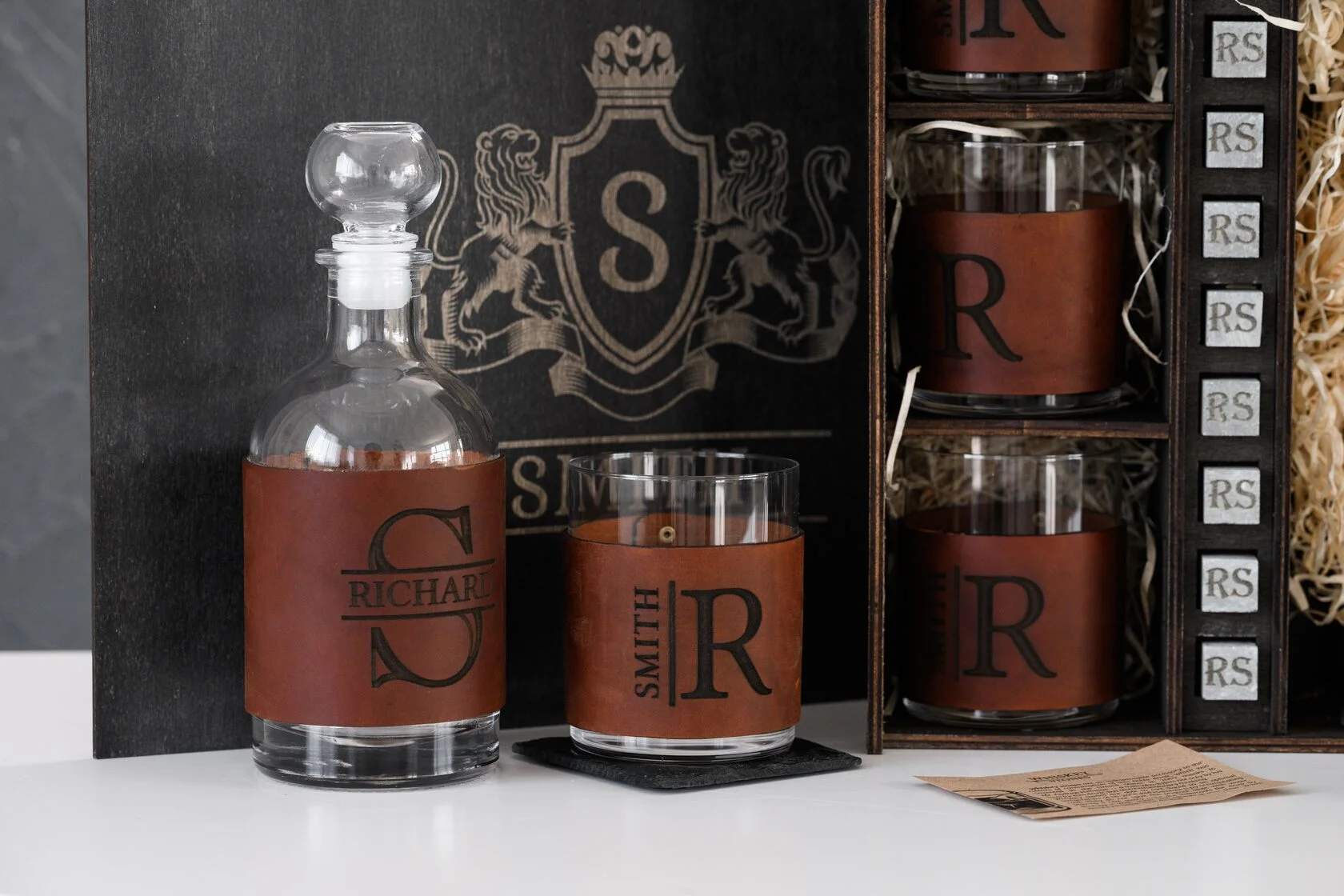 Это эксклюзивный набор с кожаными футлярами, в которых можно нанести индивидуальную гравировку. Кожа легко снимается перед мытьем, фурнитура остаётся надёжной, не разбалтывается даже при частом использовании. Чтобы сохранить внешний вид на долгое время, рекомендуется снимать кожаную отделку перед мытьем бокалов.