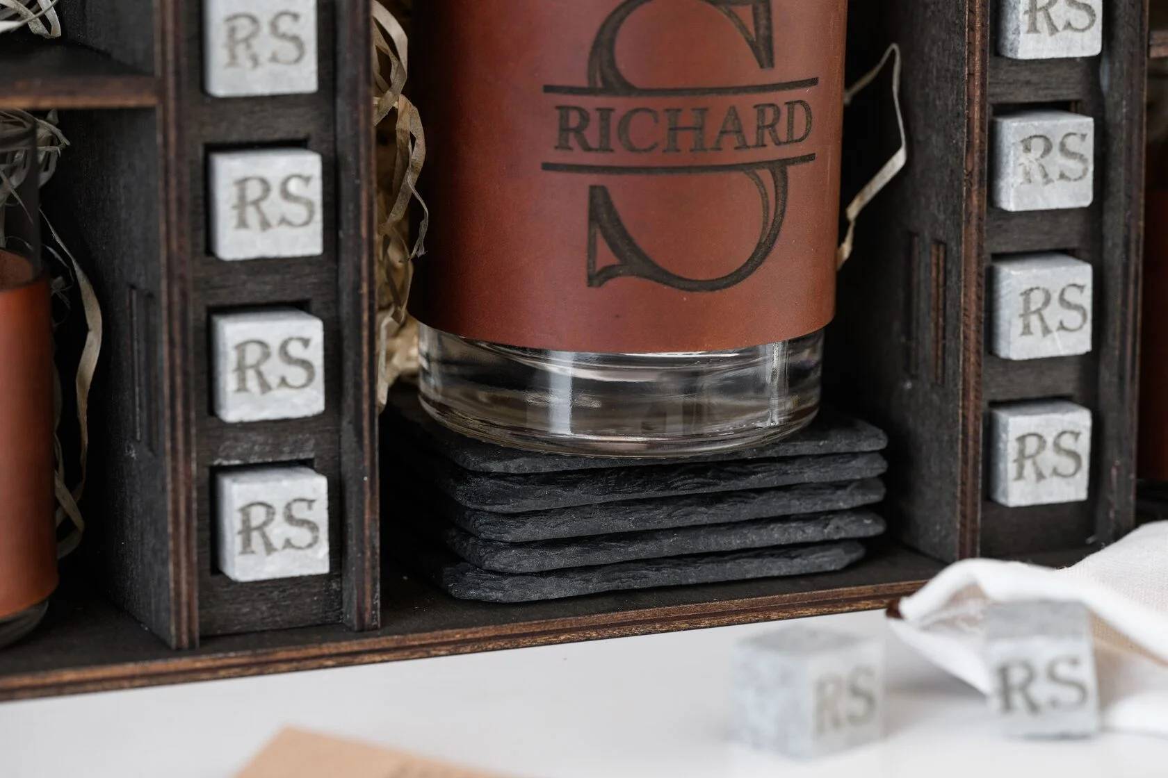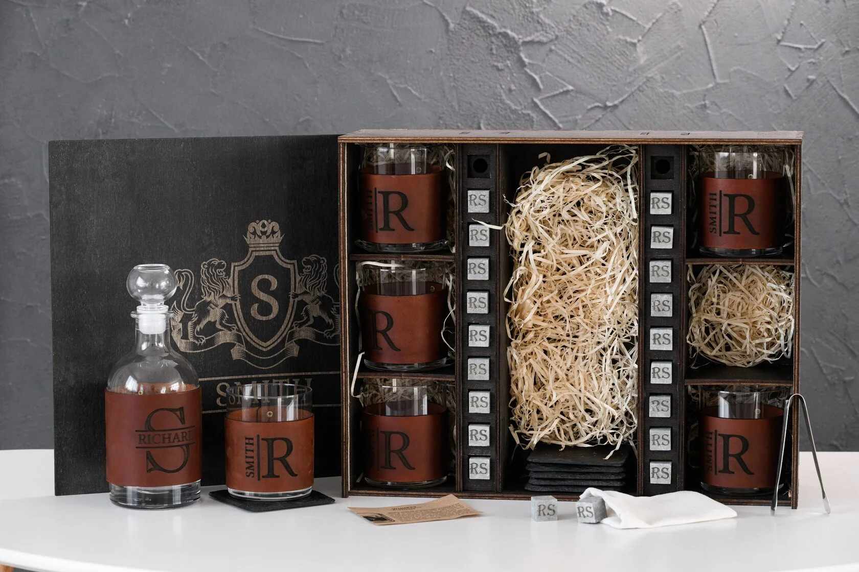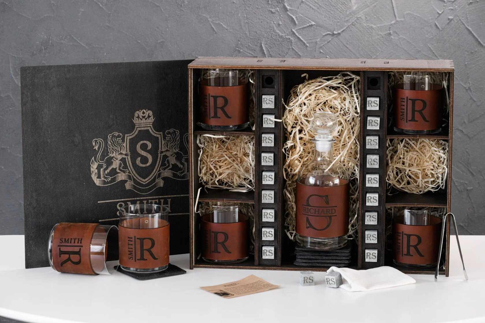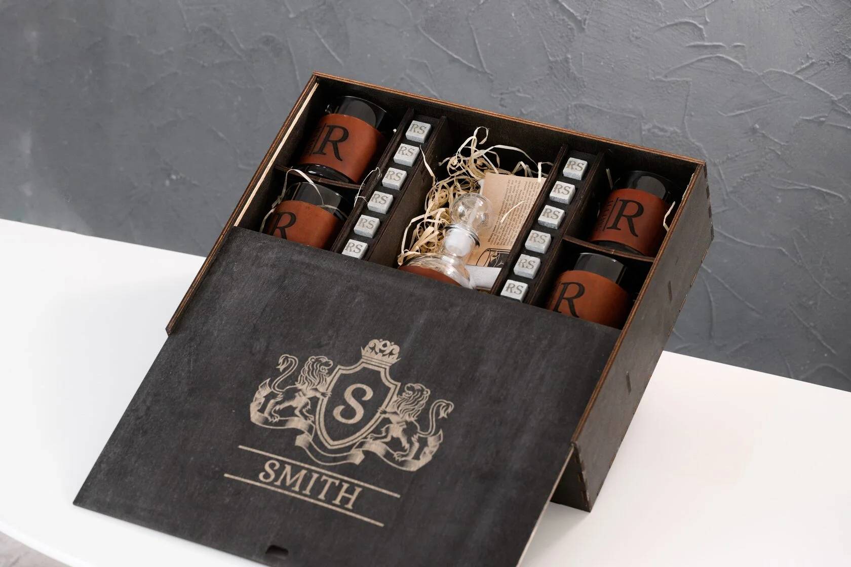 Идеальный выбор для подарка мужчине, у которого всё есть. Этот комплект — не просто функциональный, он впечатляет с первого взгляда: благородная деревянная коробка, массивный декантер, шесть бокалов в кожаных съёмных футлярах и персональные камни для охлаждения — каждая деталь говорит о вкусе, статусе и умении выбирать лучшее. Такой набор уместен и как именной подарок, и как деталь стильного интерьера домашнего бара.