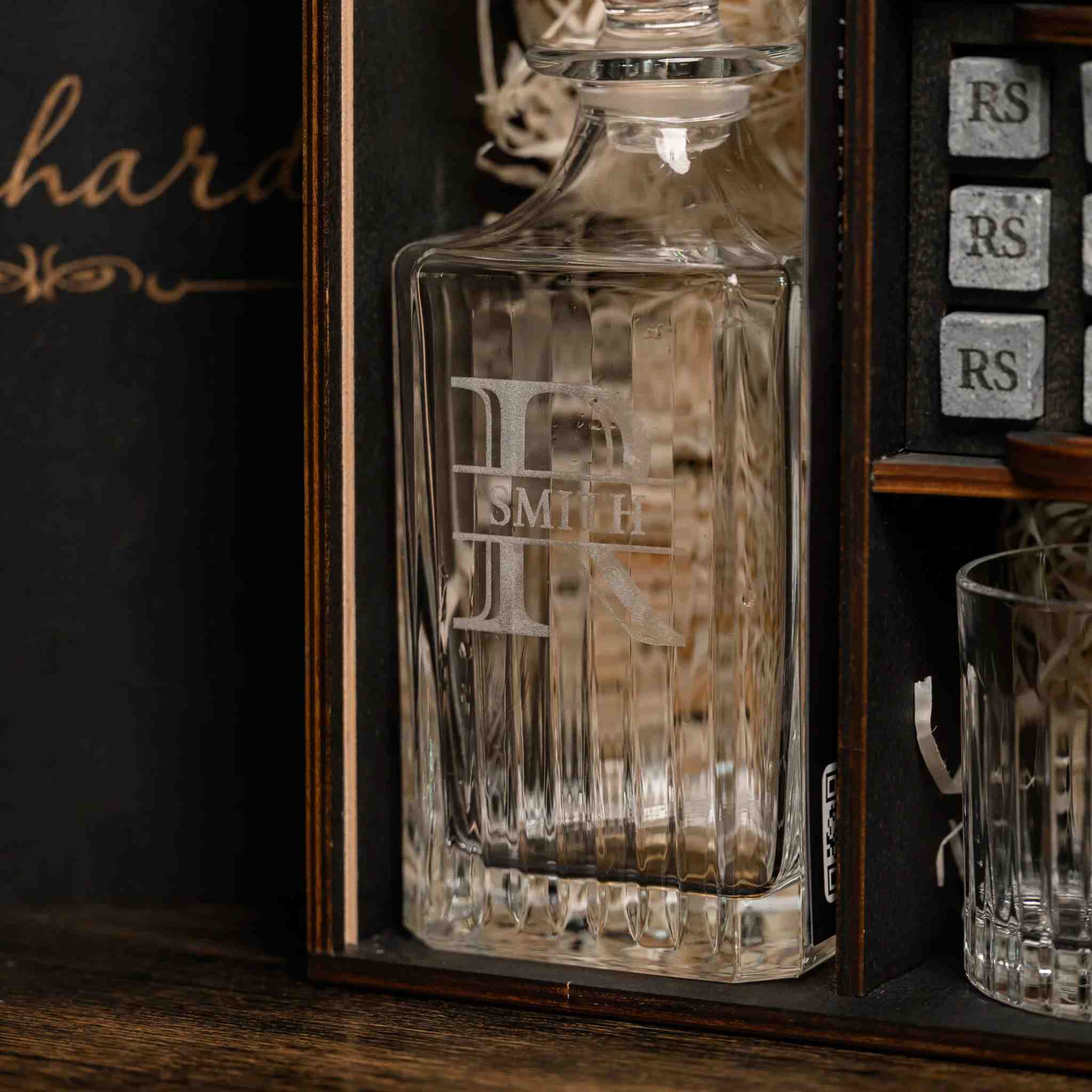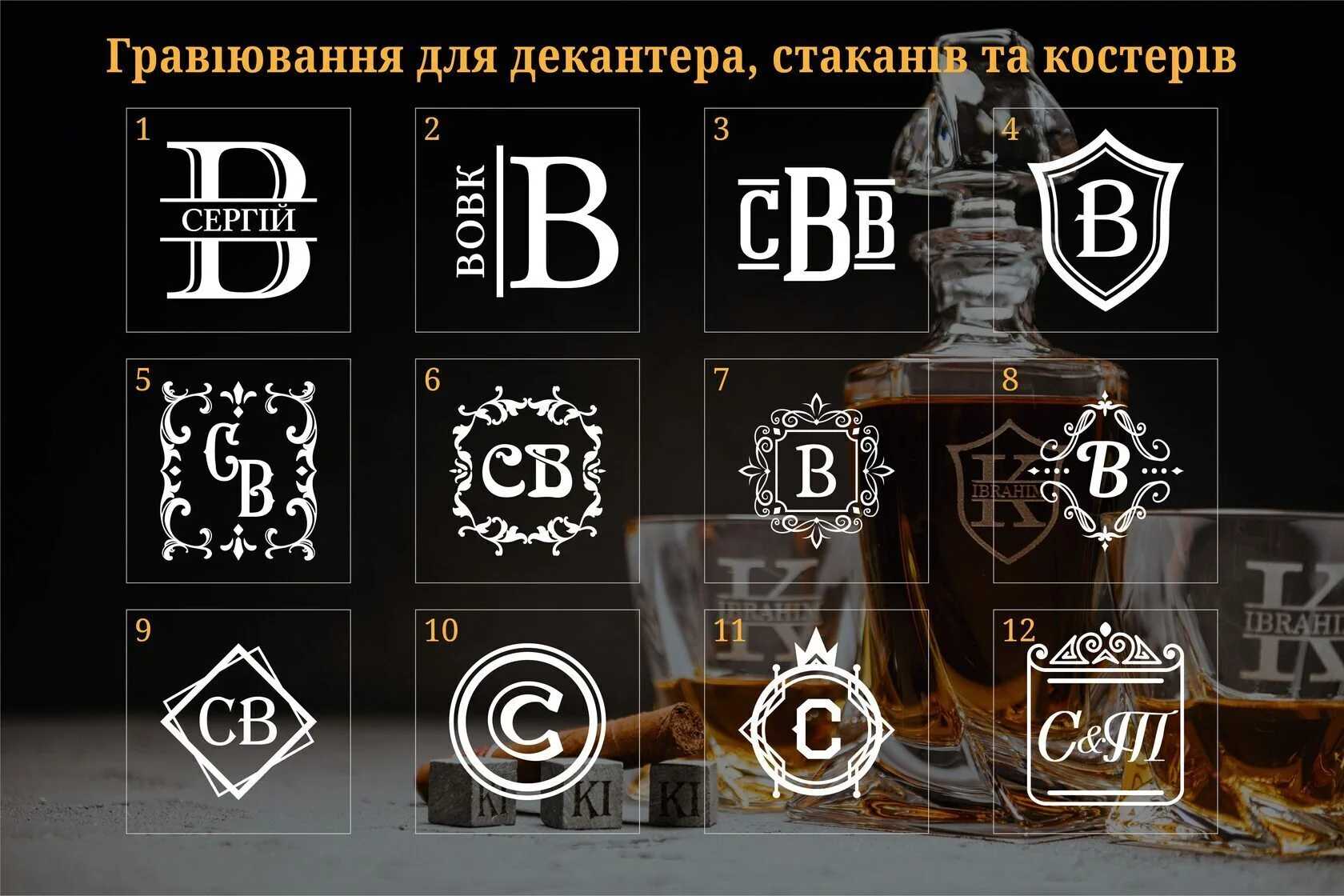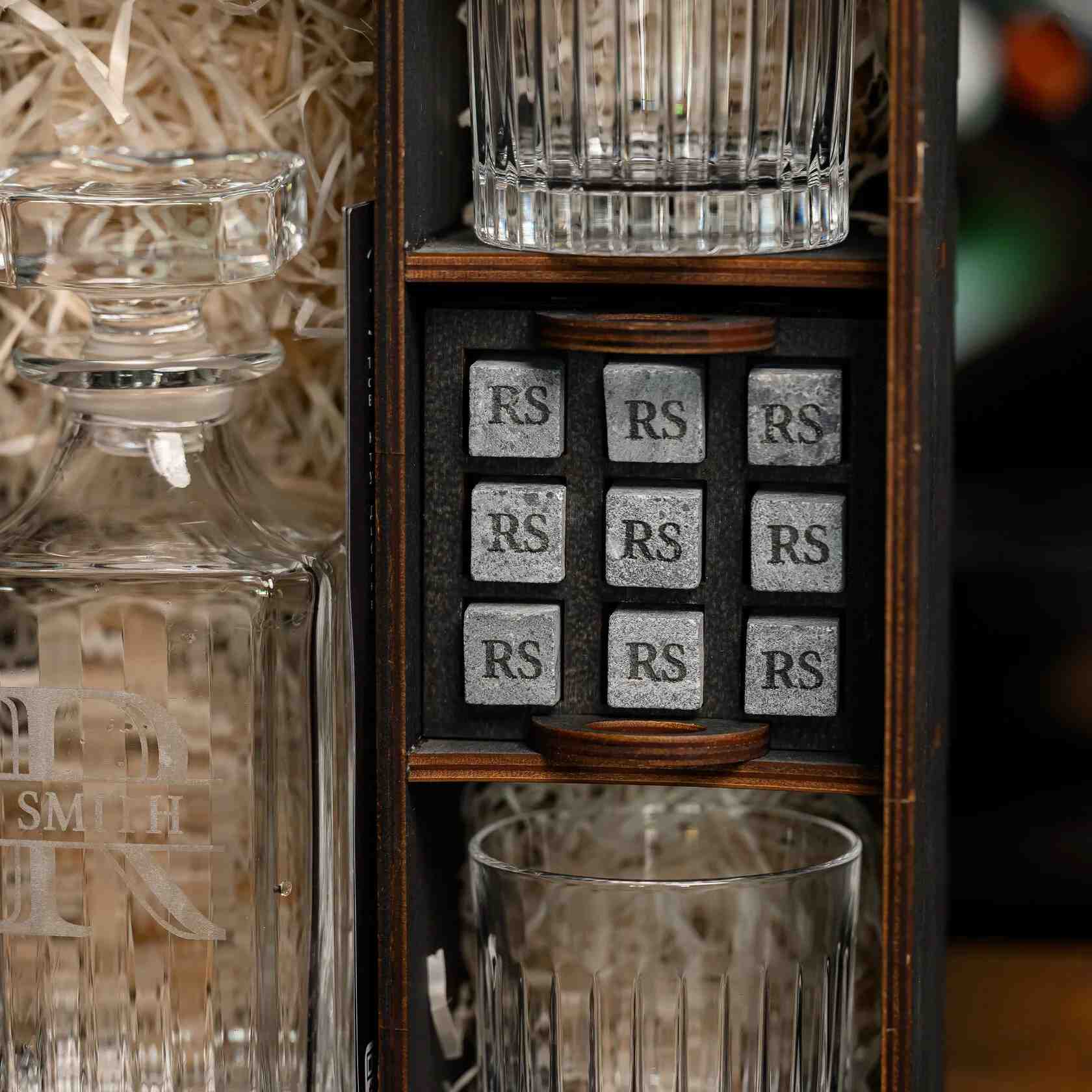 — Индивидуальная гравировка: без гравировки / на камнях / на крышке коробки / на камнях и крышке / на камнях, крышке и стаканах / на камнях, крышке, стаканах и декантере / на камнях, крышке, стаканах, декантере и подставка