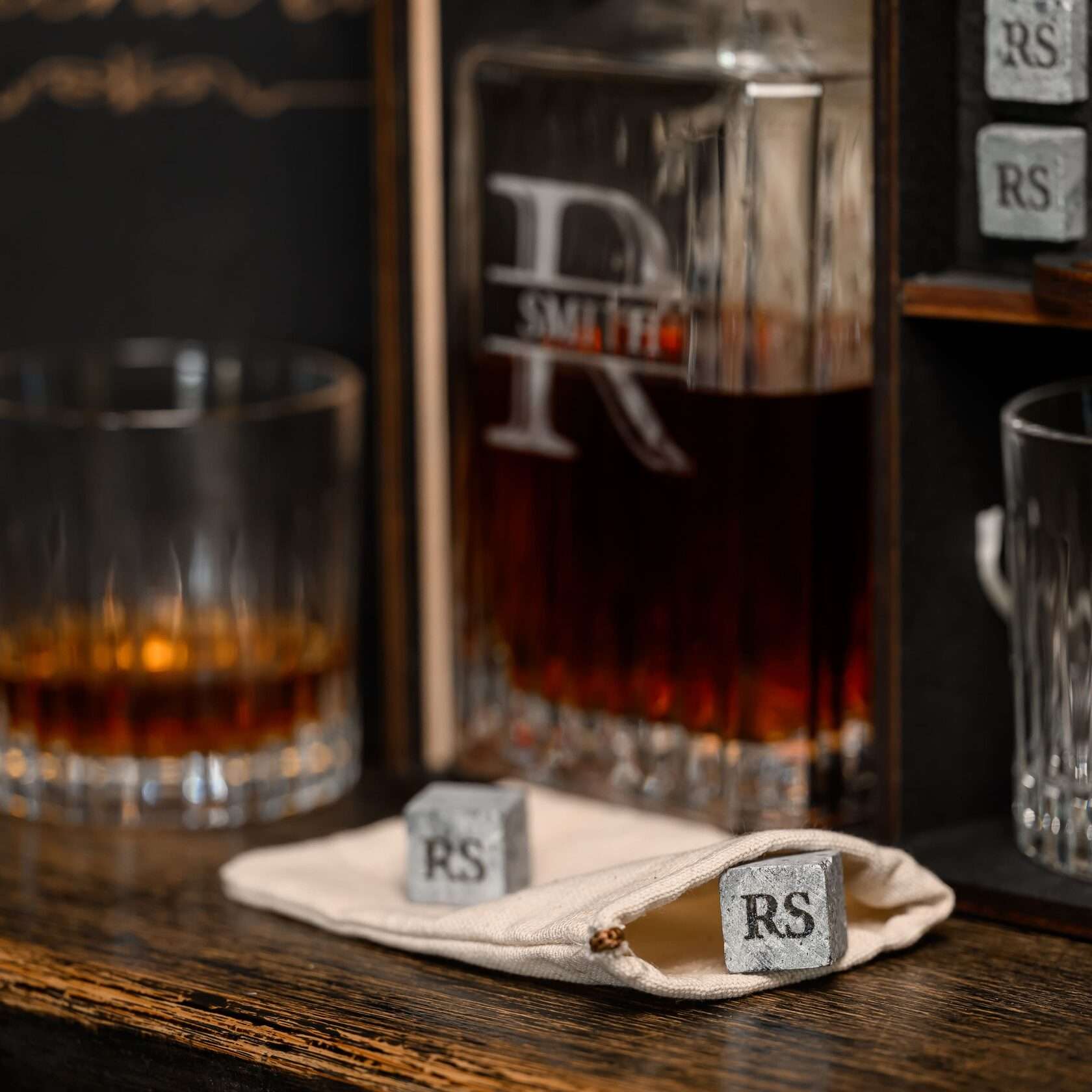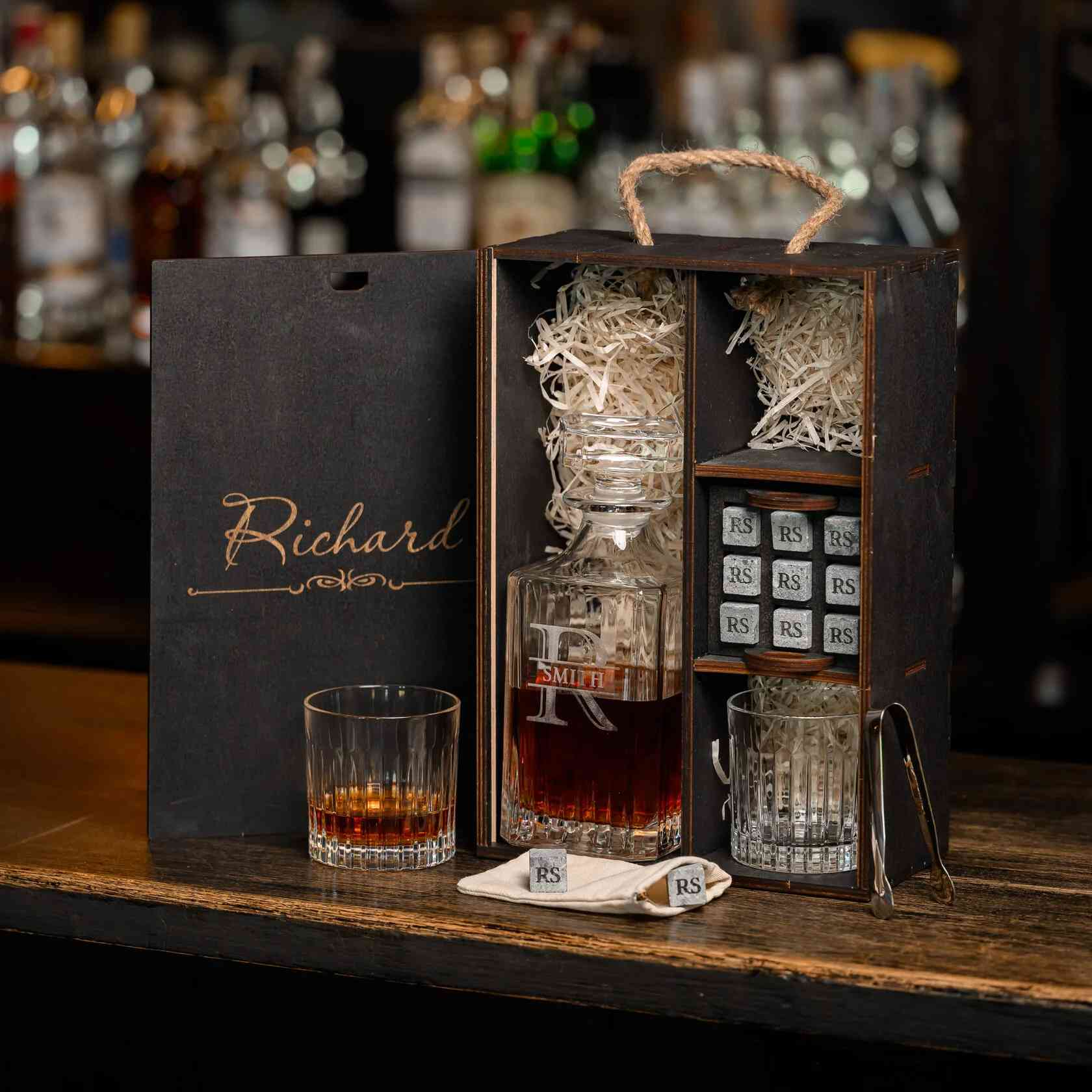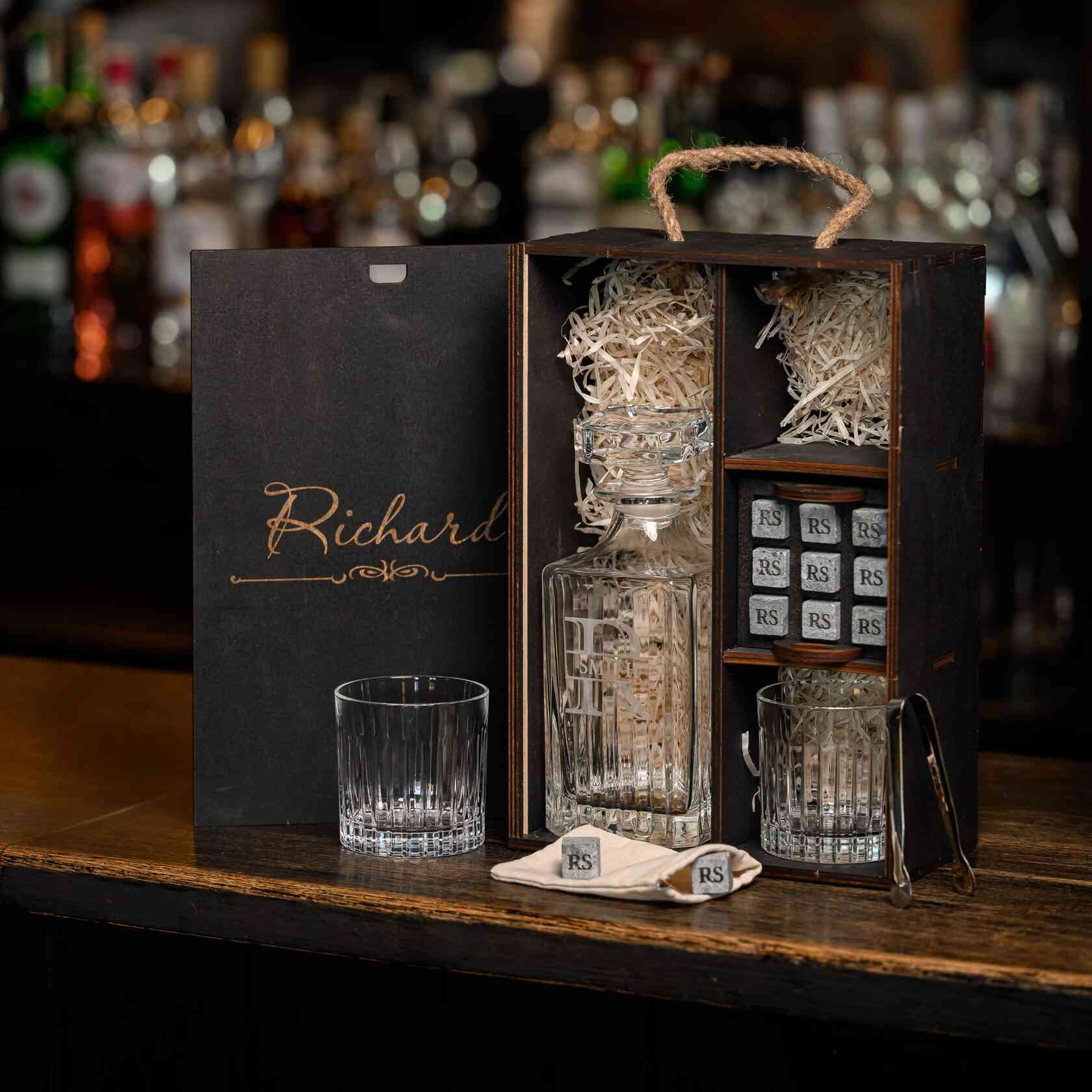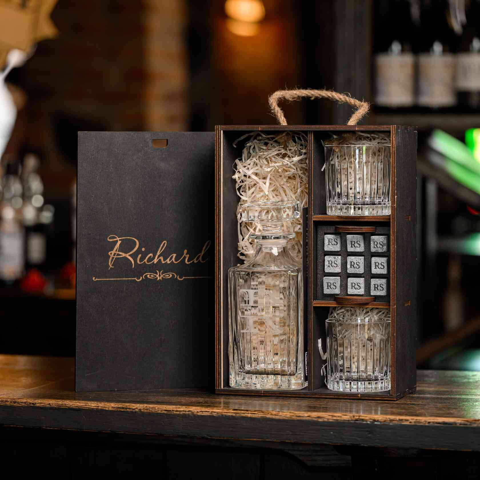 — Индивидуальная гравировка: без гравировки / на камнях / на крышке коробки / на камнях и крышке / на камнях, крышке и стаканах / на камнях, крышке, стаканах и декантере / на камнях, крышке, стаканах, декантере и подставка