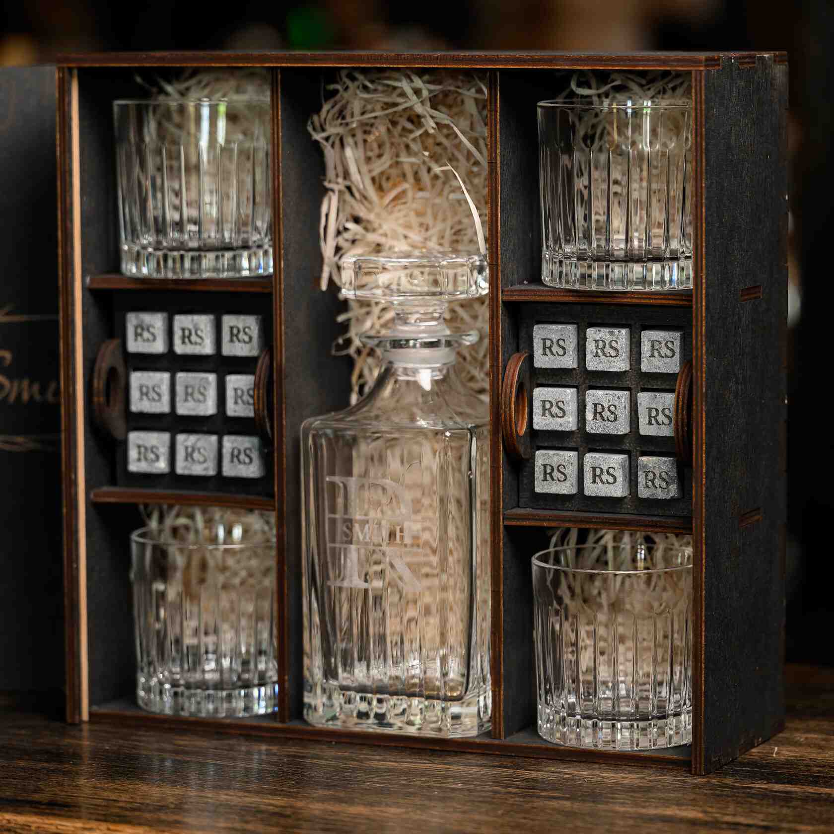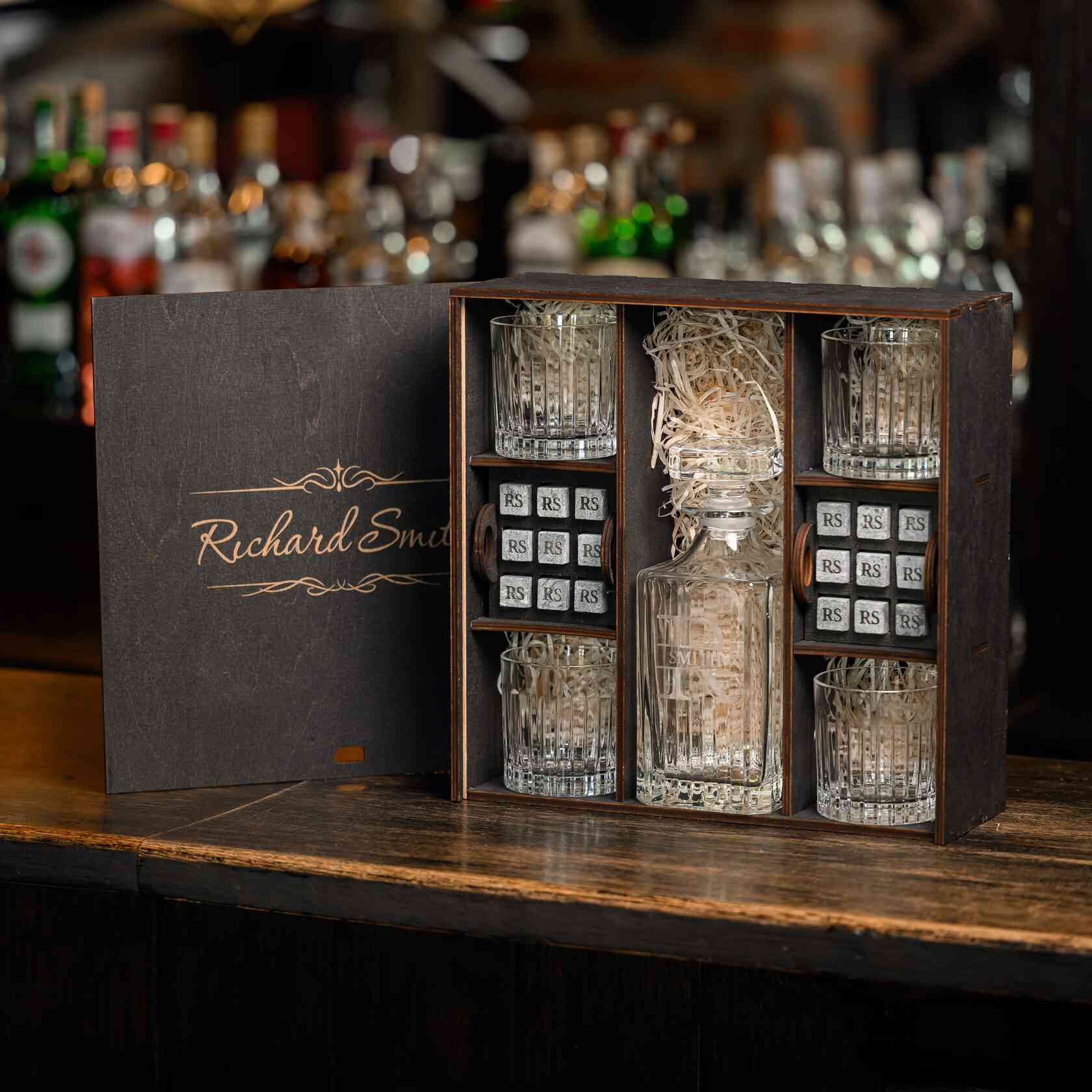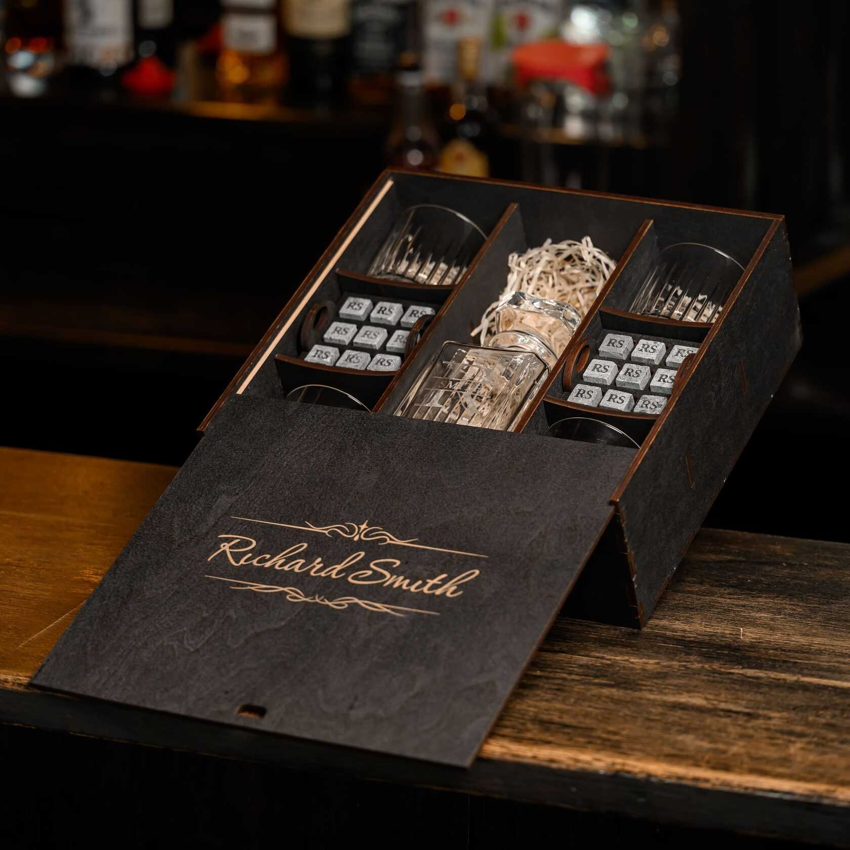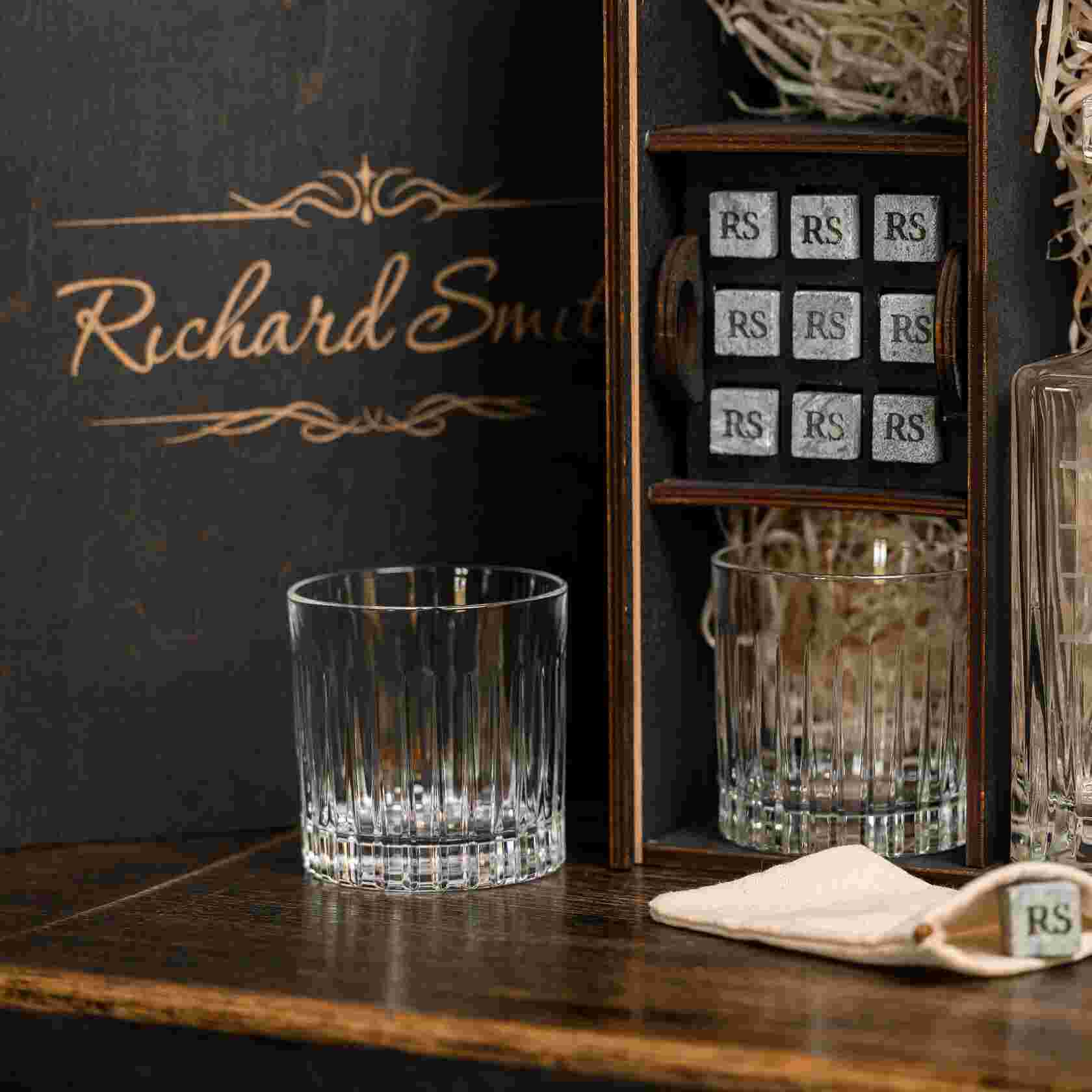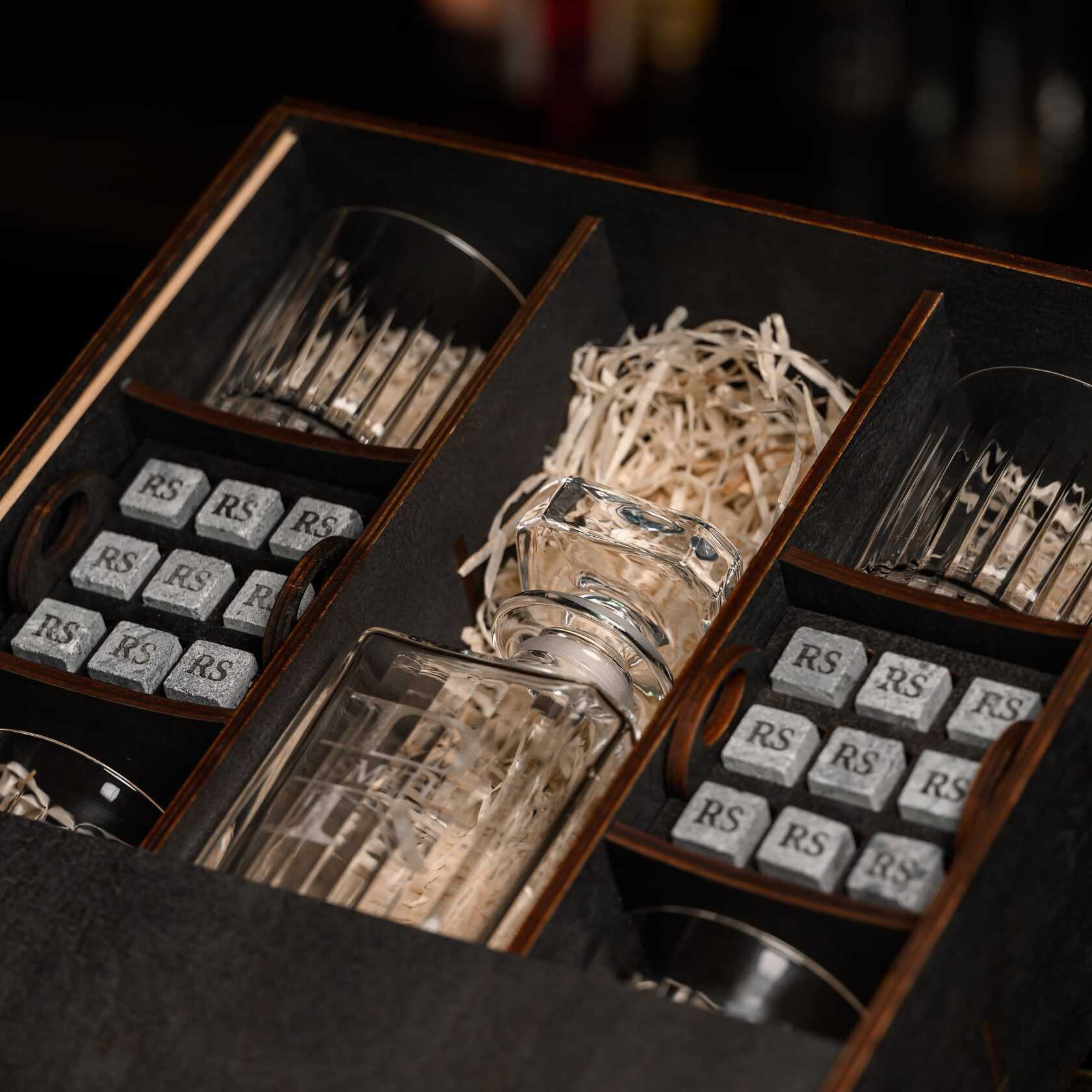 — Индивидуальная гравировка: без гравировки / на камнях / на крышке коробки / на камнях и крышке / на камнях, крышке и стаканах / на камнях, крышке, стаканах и декантере / на камнях, крышке, стаканах, декантере и подставках