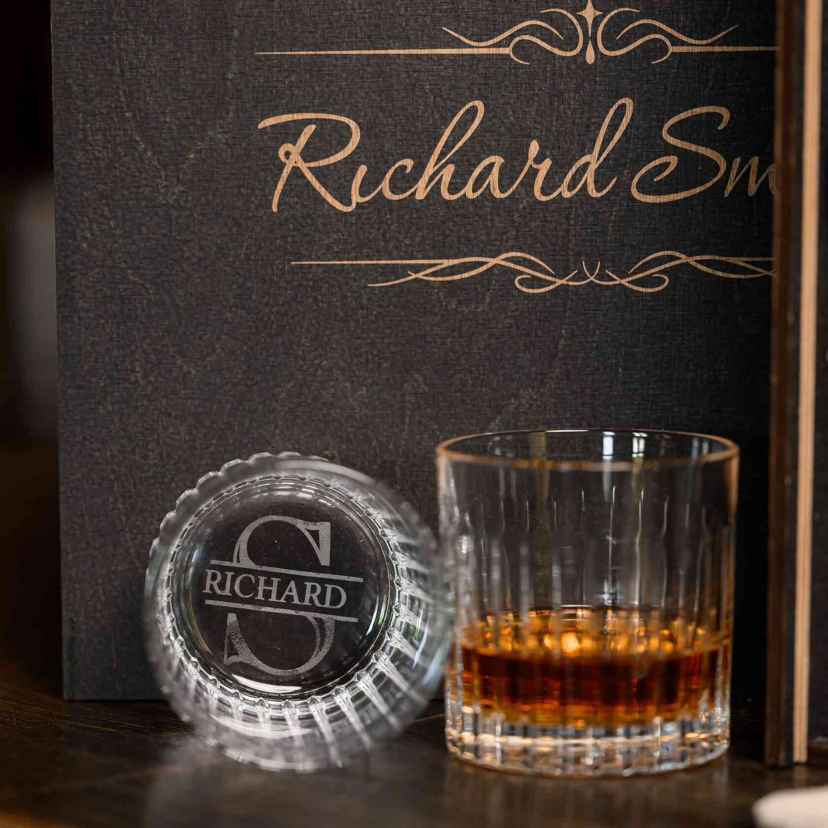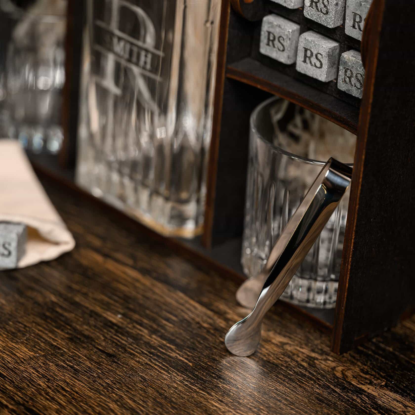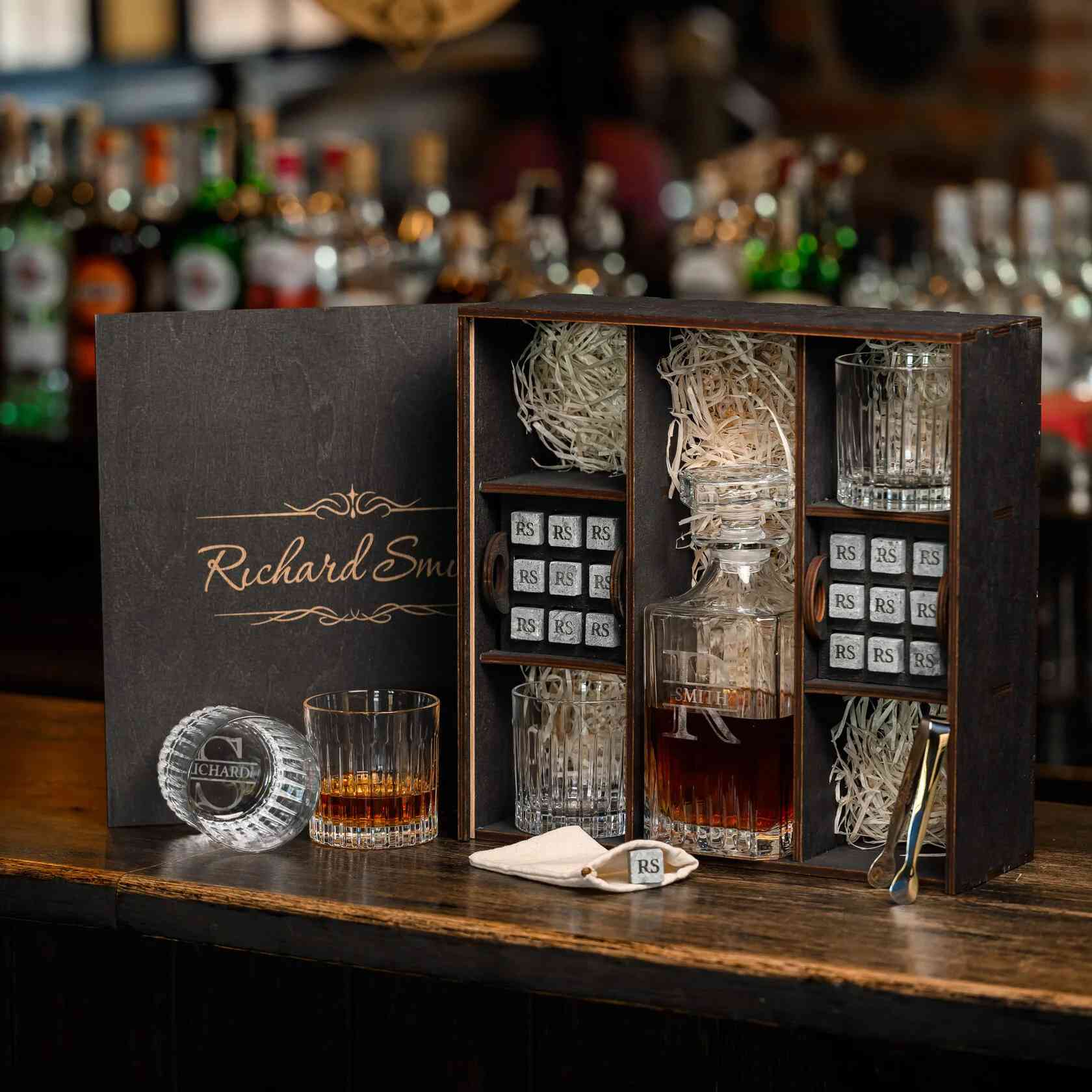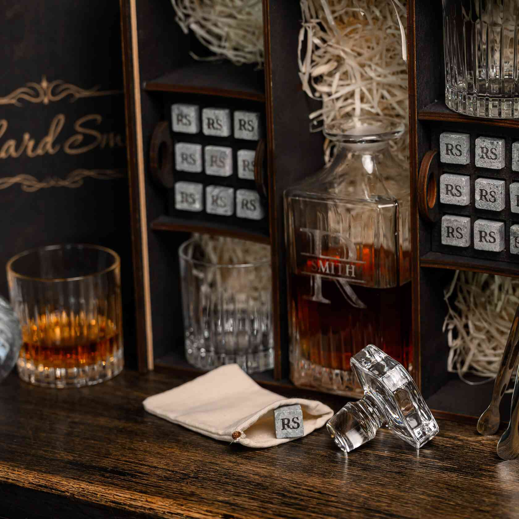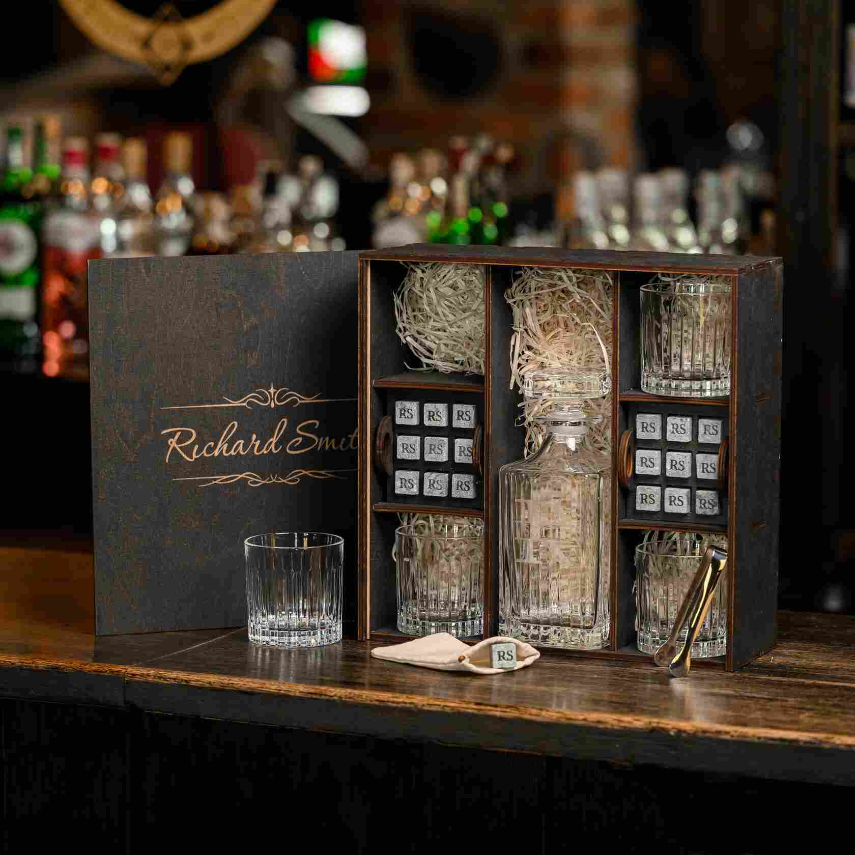 — Индивидуальная гравировка: без гравировки / на камнях / на крышке коробки / на камнях и крышке / на камнях, крышке и стаканах / на камнях, крышке, стаканах и декантере / на камнях, крышке, стаканах, декантере и подставках